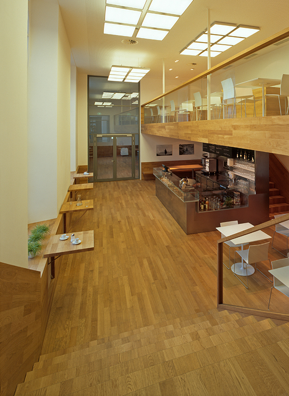 Das Cafe im 1. Stock ist vom Grundsatz der spannungsreichen Kombination moderner Formen mit traditionellen Materialien und Motiven bestimmt: Eichenholz dominiert das Erscheinungsbild. Sowohl der Boden und die eingesetzte Galerieplattform, als auch die umlaufende Wandverkleidung sind aus Eiche, wodurch ein homogener Raumfluss entsteht. In diese warmtonige Holzlandschaft sind weiße Tische und Sesseln sowie das Barmöbel aus Nirosta und Glas eingestellt. (Text: BWM Architekten)