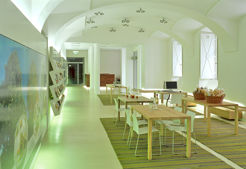 Die Kombination von modernen, klaren Formen mit traditionellen Materialien bildet den gestalterischen Rahmen. Der Stadtbauernhof als neue Informationsplattform für Stadt und Land wird bestimmt durch Massivholztische, auf denen vielfältige Informationen geboten werden. Die Tische stehen auf farblich exakt abgestimmten Fleckerlteppichen, die den Raum rhythmisieren. Eine lange Sitzbank lädt zum Verweilen ein. Die akzentuierte Beleuchtung unterstützt die freundlich helle Atmosphäre des Gewölberaumes.