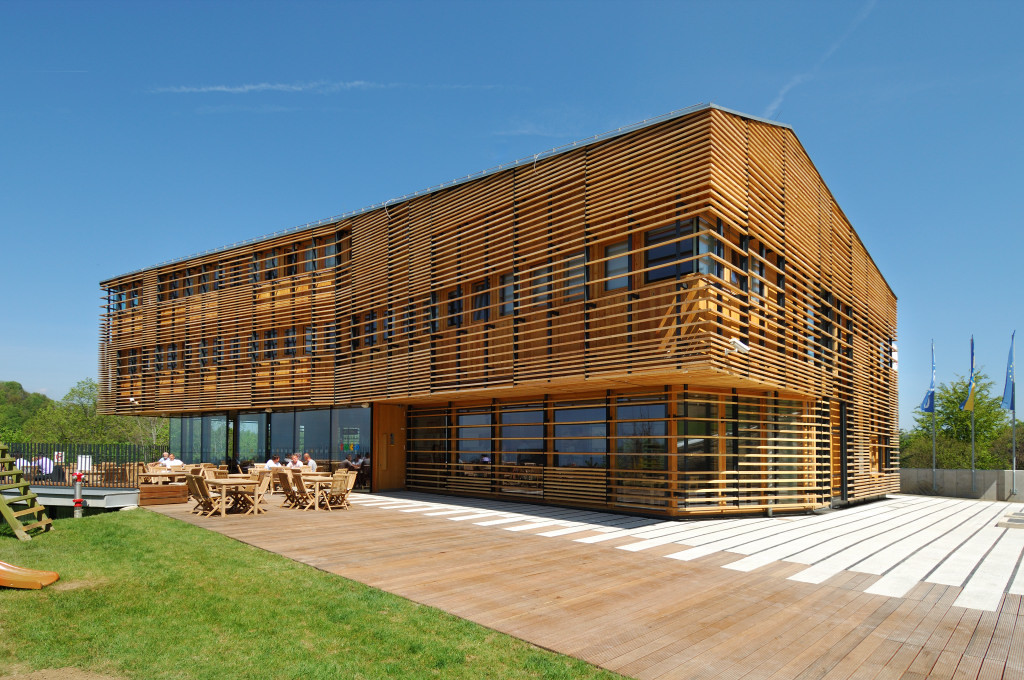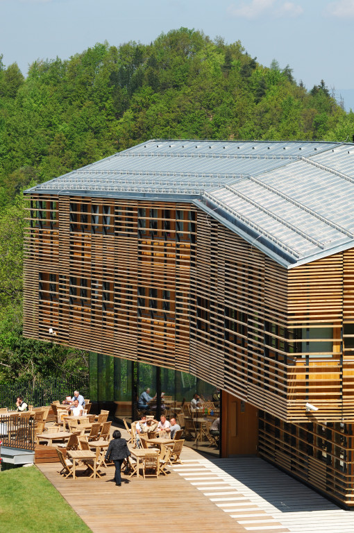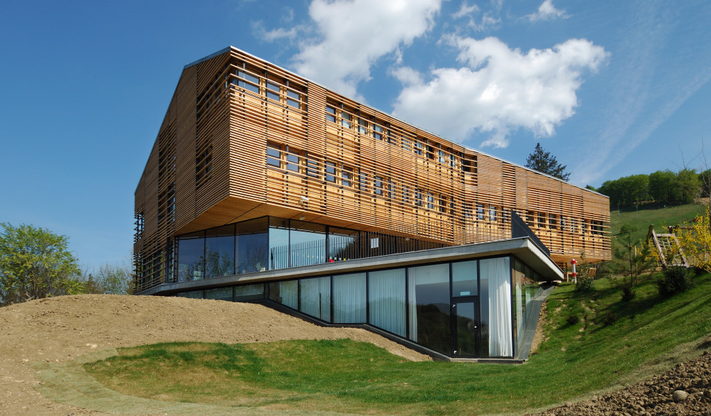 Particular attention was devoted to the tectonic design of the building. The carrying structure is limited to eight corner concrete columns which run along the middle of the building just like a spinal column and thereby support all the inter-floor armed concrete plates. The façade is completely prefabricated and constructed from wood.