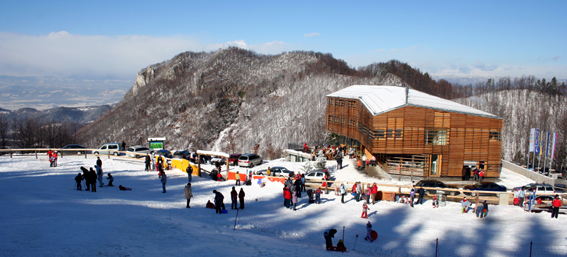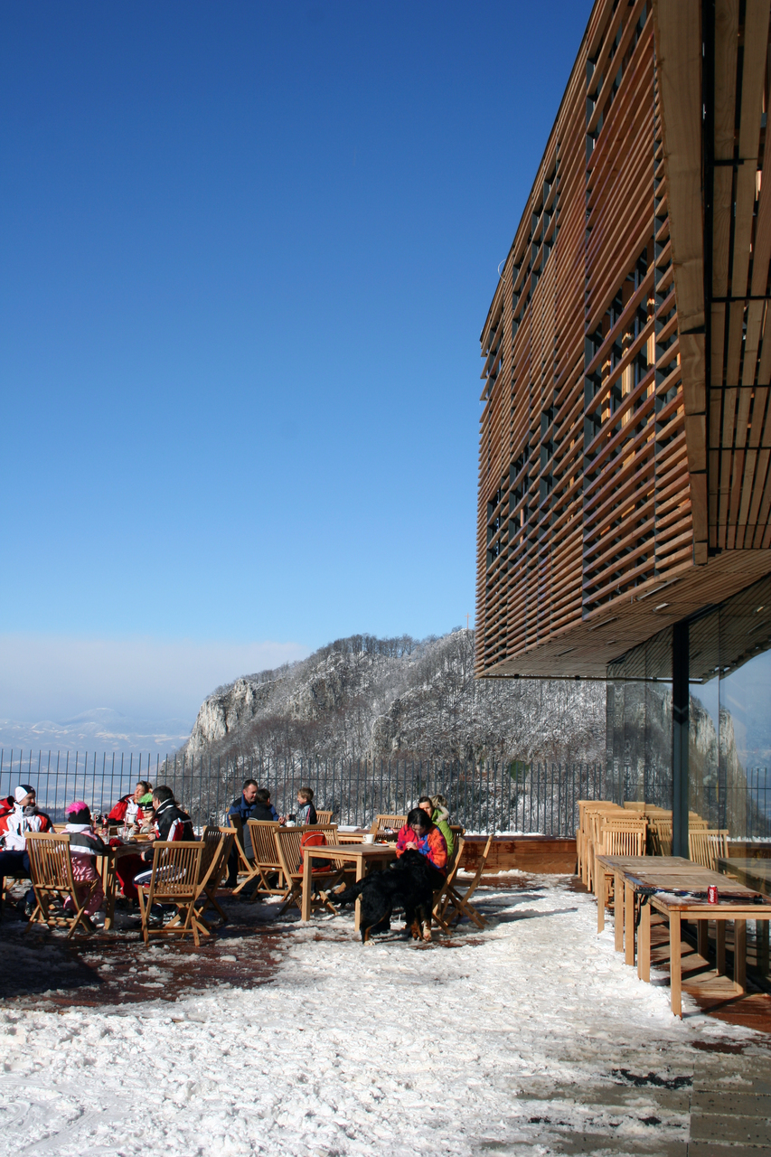 The project of designing a new Celjska koča building therefore emphasises the described duality of the given location. Upon arrival from the valley, it physically dominates the surrounding landscape and forms a unique dominating feature in the landscape, while the feature completely gives way to the magnificent panoramic view of the Celje Basin when looking from the ski slope.