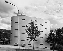 Grassman setzt hier fort. Am Autobahnknoten Hörbranz bringt die glitzernde, abgetreppte und gekurvte Schallschutzfassade als „Käs` mit Löchern“ die Signatur. Hinter diesem Schild ist die offene Skelettstruktur, großzügig verglast, mit Außenjalousien beschattet. Produktionshalle unten, dann Werkstätten, Büros; zuoberst Chefetage und Schulung, mit jeweils vorgelegten, großen Terrassen. Außen kaum spürbar: die Stiegen-Halle hinter dem Bug. (Text: Otto Kapfinger in „Baukunst in Vorarlberg seit 1980, Hrsg. VAI / KUB“)