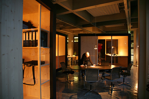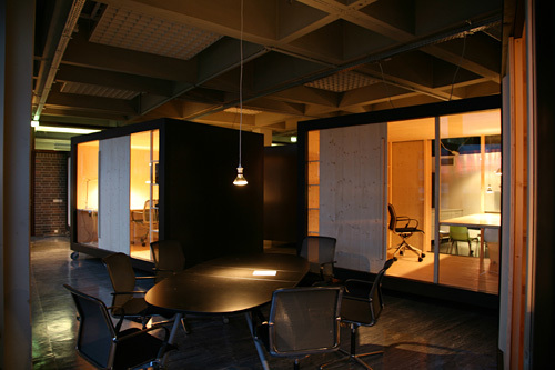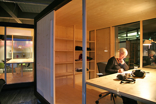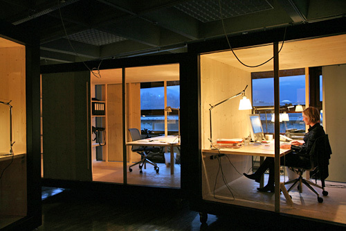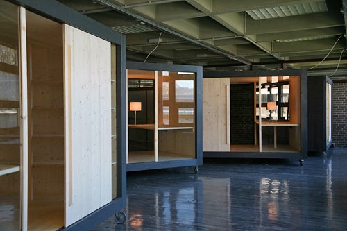 Es ist schwer festzustellen, ob es sich hier um eine Versammlung kleiner Wohnwagen, um große Möbel oder um Minimal Art handelt. Das Projekt erinnert sowohl an Archizooms Residential Parking Lots und Habitable Cupboard (etwa 1970) als auch an Joep van Lieshouts Wohnwagen. Das im Jahr 2006 neu gegründete Institut für Architekturtheorie befindet sich in zwei ehemaligen Seminarräumen der Architekturfakultät. Die Trennwand wurde entfernt, wodurch ein großer, loftartiger Raum entstand. Dieser Raum wurde so belassen, wie er vorgefunden wurde, einschließlich Linoleumboden, kaputten Glasfassaden und brutalistischen Betondecken. Trotzdem hat jeder Mitarbeiter und jede Mitarbeiterin einen eigenen Arbeitsraum, in den er oder sie sich zurückziehen kann, um ungestört zu telefonieren, im Internet zu surfen oder zu studieren.Die Boxen stehen aus unterschiedlichen Gründen auf Rädern. Erstens bleibt dadurch die räumliche Organisation des Instituts flexibel. Falls intensive Zusammenarbeit notwendig ist, können die Boxen zusammengefügt werden, besteht hingegen der Wunsch nach Privatheit, können sie voneinander weggedreht oder auch zur Seite geschoben werden, wenn ein Gastvortrag oder ein Fest im Institut stattfindet. Zweitens kann aber auch die bestehende Klimaanlage ohne kostspielige Anpassungen im Sommer weiterhin funktionieren. Stromauslässe befinden sich an der Decke, Internet und Telefon sind drahtlos gelöst. Informell angeordnet, lassen die Boxen Platz für großzügige Begegnungsräume. Dort stehen, ebenfalls auf Rädern, Sitzungstische und Seminartische, außerdem gibt es eine Küche. Lampen werden einfach mit Haken von der Decke abgehängt. Und damit auch diese nicht an einen festen Platz gebunden sind, werden die Schalter direkt bei der Steckdose mittels drahtloser Fernbedienungen betätigt. Zusätzlich bilden Schrankwände flexible Trennwände. Für ein minimales Budget wurde hier maximaler Raum geschaffen und eine optimale Abenteuerlichkeit erreicht. (Text: Bart Lootsma)