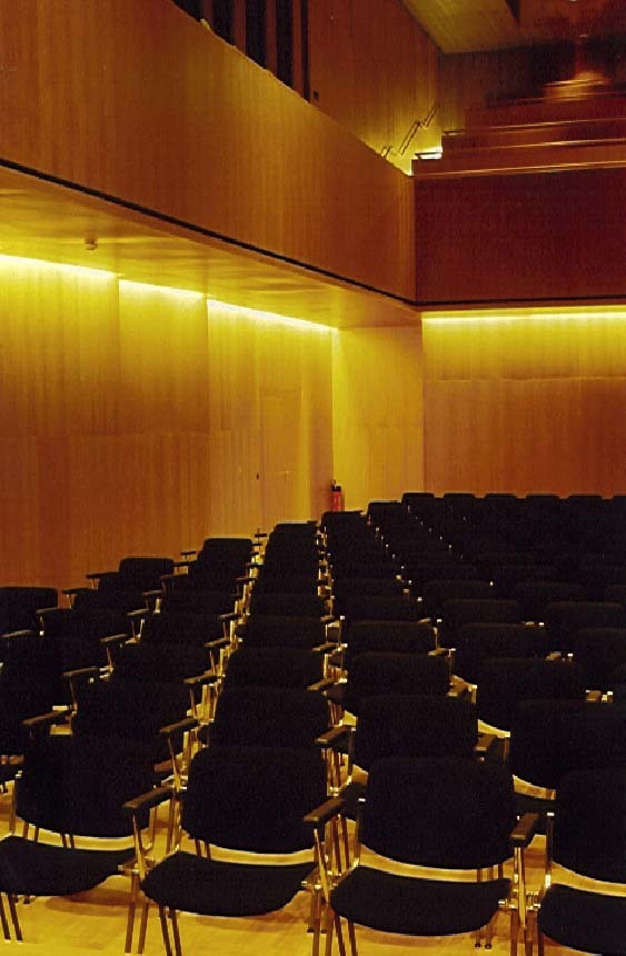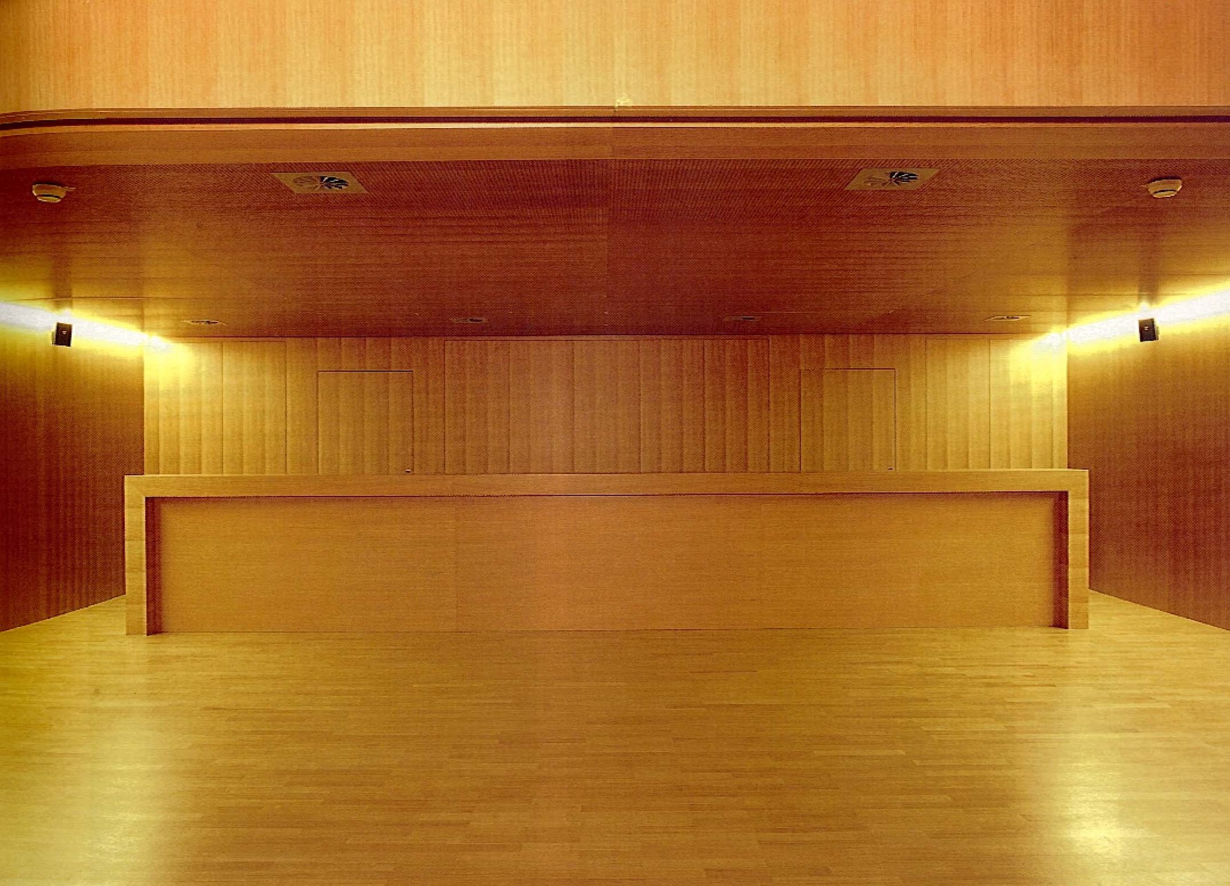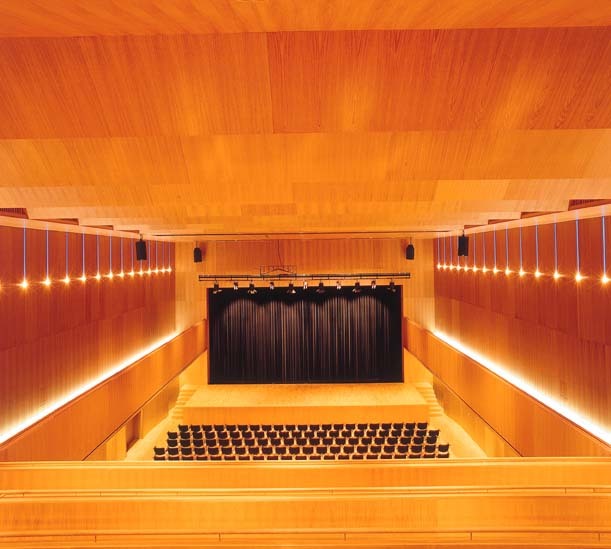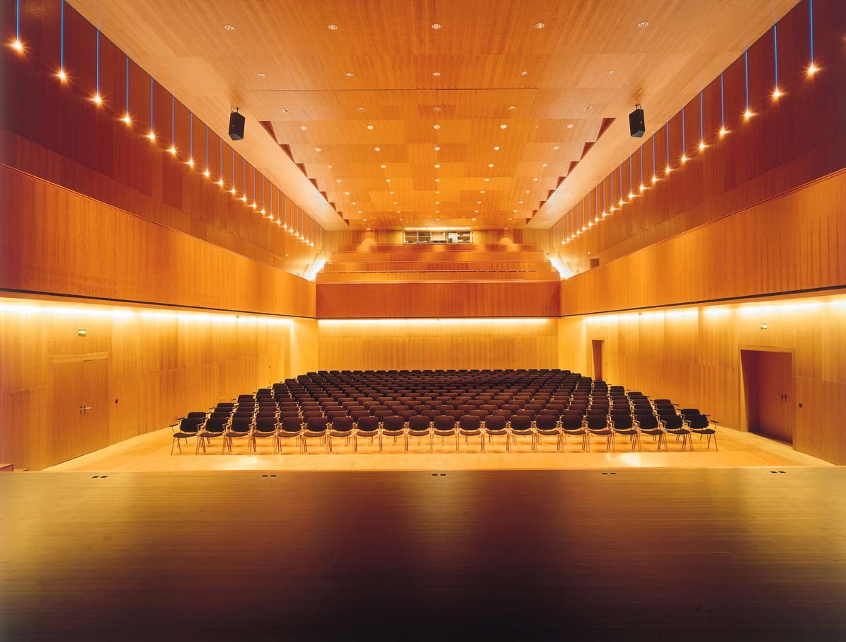Der große Veranstaltungsraum ist aus einzelnen Teilvolumen zusammen gefügt: der in die Höhe strebende Bühnenraum, die anpassungsfähige bis zum Orchestergraben veränderbare Vorbühne, das Parkett und das darüber liegende Galeriegeschoss.