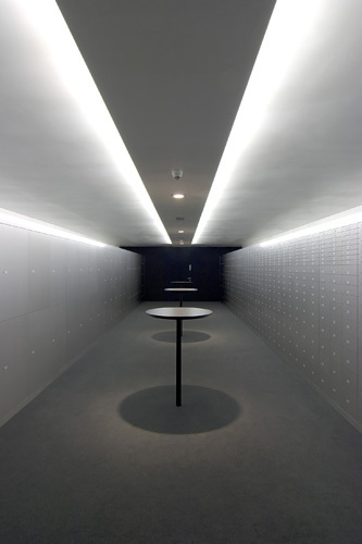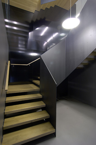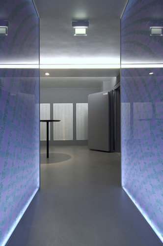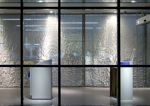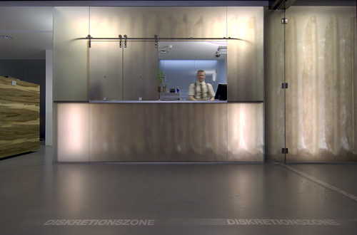 Entlang der Leopoldstrasse als Teil der historischen Nord-Süd-Achse Innsbrucks sind die Funktionsbereiche der Bank in mehreren Raumschichten angeordnet. Diese Schichtung setzt sich auch im Lichtkonzept und der Möblierung bis hin zu der künstlerisch gestalteten Glasrückwand fort und verleiht dem Foyer Tiefenwirkung und Großzügigkeit. Auch außerhalb der Banköffnungszeiten steht die angebotene Dienstleistung im Vordergrund: die Selbstbedienungszone als lang gestreckter, hell erleuchteter Raum bildet eine Erweiterung des Straßenraumes Leopoldstraße, die Kunden an den Service-Geräten stehen im Mittelpunkt. Eine eigens entwickelte Rückwand aus feinem Metallgewebe bildet den silbrig schimmernden Hintergrund für die nächtliche Lichtinszenierung.