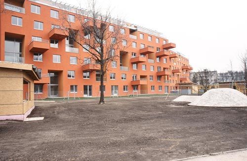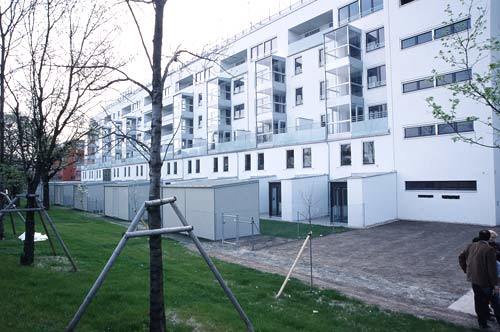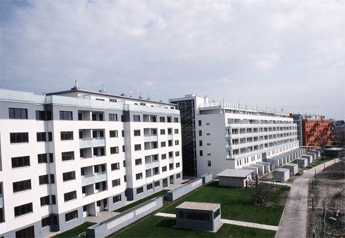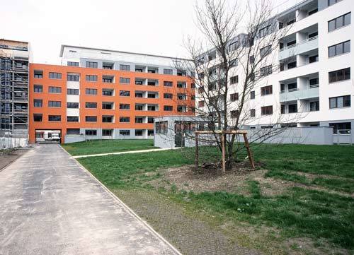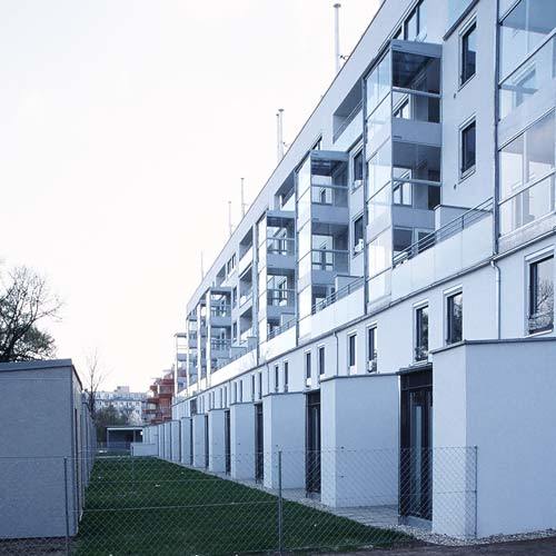 Es gilt gleiches Recht für alle: Da auf dem Dach des mittleren Bauteils das Glücksversprechen eines Swimmingpools eingelöst wird, sind alle drei Bauteile mit Glasbrücken miteinander verbunden, sodass sämtliche Bewohner der Anlage das Schwimmbecken trockenen Fußes erreichen können. Der Bauteil A (Cufer) besteht aus zwei sechsgeschossigen Baukörpern mit je einem Staffelgeschoss, wobei an der Rudolf-Virchow-Straße eine etwas schwierige Kopfbausituation zu lösen war. Den spitzwinkeligen Grundstücksabschluss an der Kreuzung zur Prager Straße bildet eine durch Gestaltung nobilitierte Feuermauer, die auch bei Nichtverbauung des Nachbargrundstückes eine attraktive Ecksituation schafft. „Ein Hauptthema der Fassade ist der Lärmschutz“, so die Architektin, „der durch die Verglasung des Laubenganges sowie durch die am Laubengang angedockten Einlagerungsräume erreicht wird. Diese - meist den Wohnungen direkt gegenüberliegenden - Einlagerungsräume sollen den Bewohnern das In-den-Keller-gehen-müssen“ ersparen." In den ausgetüftelten Wohnungszuschnitten kommen auch in den kleineren Appartments Qualitäten (unaufgeregte Großzügigkeiten) zum Vorschein, die im geförderten Wohnbau nach wie vor keine Selbstverständlichkeit sind. Ein Schriftzug von Gabriele Lenz an der Rudolf-Virchow-Straßenfassade verankert das neue Volumen im heterogen bebauten Stadtraum. An den Bauteil A dockt eine (derzeit noch in Bau befindliche) Wohnhausanlage von s+s Architekten und Johannes und Hermann Kaufmann an, wobei man sich hofseitig einen geräumigen Grünraum luxuriösen Ausmaßes teilt. Der mittlere Bauteil B (Glück) punktet nicht nur mit dem bewährten Prinzip „Schwimmdach“, sondern weist auch in der Erschließung und Grundrissgestaltung neue Qualitäten auf. Den augenscheinlichen Schlusspunkt der Wohnbaukette bildet der aus zwei leicht gegeneinander verdrehten Kubaturen bestehende Bautel C (Lainer), wobei versucht wurde, eine Steigerung der Wohnungsqualität durch zweigeschossige Loggien und Wohnräume zu erreichen. Zitat Lainer: „Durch den Einsatz eines modularen Prinzips für die Grundrissentwicklung wird eine hohe Flexibilität erzielt, und auch spätere Zusammenlegungen und/oder Teilungen von Wohnungen werden ermöglicht.“ (Text: Gabriele Kaiser)