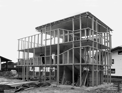 Die aufmerksame Abfolge introvertierter und extrovertierter Zonen und höchste Ökonomie bei materiellen und energetischen Ressourcen sind die Themen dieses Hauses, Licht und Ausblick durch die bewegten Glasbänder akzentuieren Rückzug oder Weite. Die Reduktion aufs Nötigste eröffnet hier der Familie die Freiheit, die sie zum lebendigen Wachsen braucht. Installationsführende Fertigteildecken, aus deren Löchern lapidar Glühbirnen ragen, und rau verputzte Stahlbetonscheiben bilden konstruktive Grundstruktur und fast türlos auf jeder Ebene differenziert fließenden Raum. Stark gedämmt, wirken sie auch als betonkernaktivierte, gedämmte Speichermasse für den Niedrigenergiestandard und die schalltechnische Trennung des Einliegers. Blickweitend knickt sich das Horizontalband in dessen Wohnküche am Südwesteck abwärts, um sich überm offenen Badeflur dezent lichtspendend an die Decke zurückzuziehen.