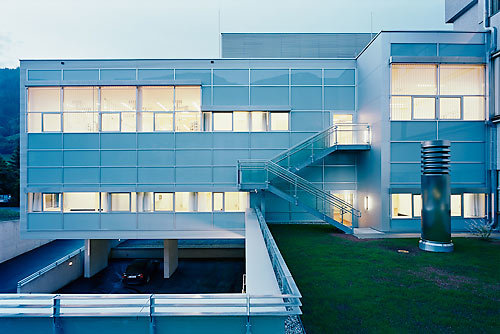 Die Schmalseite des zweigeschossigen Riegels ist mit fein strukturierten, gerillten Aluminiumprofilen großflächig verkleidet. Lediglich zwei schmale Fensterbänder durchbrechen die in ihrer Wirkung plastische Gebäudehülle und geben den Blick frei auf die nahe gelegene Burganlage Strechau. Die großflächige Untersicht der Auskragung ist als fünfte Fassade mit technisch eloxierten Aluminiumtafeln verblendet und wird mit Einbruch der Dunkelheit indirekt beleuchtet. (Text: Architekten)