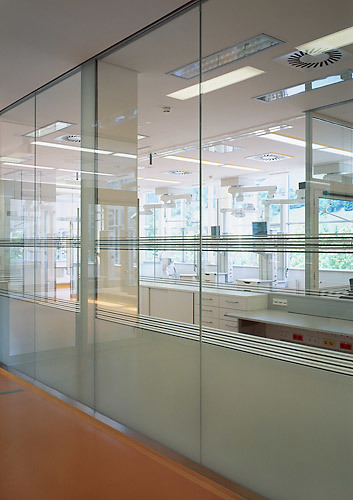 Das Raum- und Funktionsprogramm des neuen Erweiterungsbaues ist horizontal organisiert und unter Minimierung der inneren Erschließung werden die einzelnen Funktionsbereiche zwischen Bestand und Neubau vernetzt. Im Bereich des Untergeschosses wird die bestehende Dialysestation um weitere Behandlungsplätze sowie entsprechende Nebenräume erweitert. Die Räume der zentralen Anlieferung werden in den Hang eingebaut und gruppieren sich um einen Hof. Im Erdgeschoß sind die radiologische Abteilung samt einer Raumgruppe für einen hochmodernen Magnetresonanz- Tomographen, Ambulanzbereiche sowie Dienstzimmer für Ärzte und das Pflegepersonal angeordnet. Das Obergeschoß umfasst die Intensivstation mit den verschiedenen Pflegebereichen ICU und IMC. Die Patientenbereiche zeichnen sich durch eine offene und lichtdurchflutete Raumwirkung aus. Im Bereich der Intensivstation wurden die notwendigen Trennwände in Nurglaskonstruktionen errichtet um von allen Betten den Blick auf das umgebende Bergpanorama zu ermöglichen.
