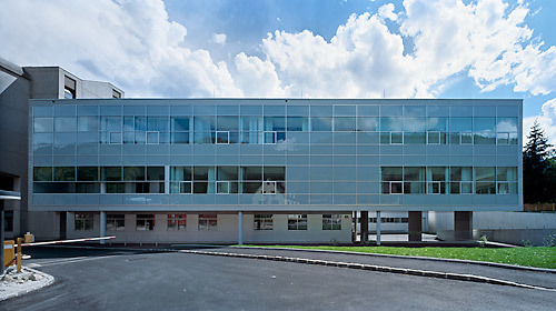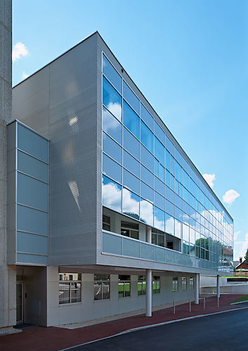 Der neue Funktionstrakt schließt westseitig an das bestehende Landeskrankenhaus an und erstreckt sich auf eine Länge von rund 45 Meter entlang der Gemeindestrasse. Die beiden Obergeschoße sind zu einem riegelähnlichen Baukörper zusammengefasst, der vom zurückversetzten Untergeschoß formal losgelöst ist und dadurch eine markante schwebende Wirkung erzielt. Die klare, moderne Formensprache des kubischen Neubaus schafft einen bewussten Kontrapunkt zum Altbestand des Landeskrankenhauses.Der Zubau ist vom bestehenden Gebäude abgerückt und durch einen verglasten Gang verbunden. Durch diese Zäsur wird die einheitliche Erscheinung des Baukörpers unterstrichen. Die durchgehende Verglasung der Längsfassade, die durch siebbedruckte Flächen strukturiert wird, ist einladend und offen.