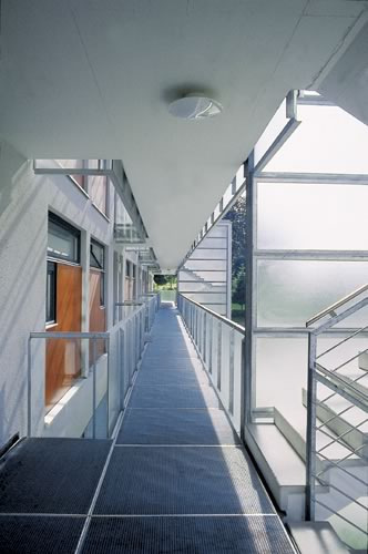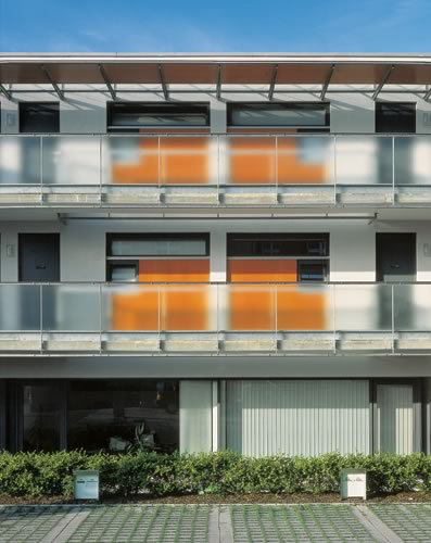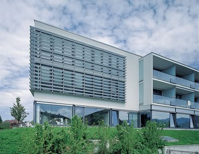 Geschäfts- und Büronutzung im gesamten, vollflächig verglasten Erdgeschoss und im bauplastisch differenzierten „Kopf“ der dreigeschossigen Anlage, sonst Wohnungen mit südseitigen Loggien; vom Baukörper nordseitig klar abgesetzt die brückenartigen Laubengänge, die mit den vorspringenden Stiegenhäusern eine feingliedrige, semitransparente Schicht zum Vorplatz bilden. (Text: Otto Kapfinger in „Baukunst in Vorarlberg seit 1980, Hrsg. VAI / KUB“)