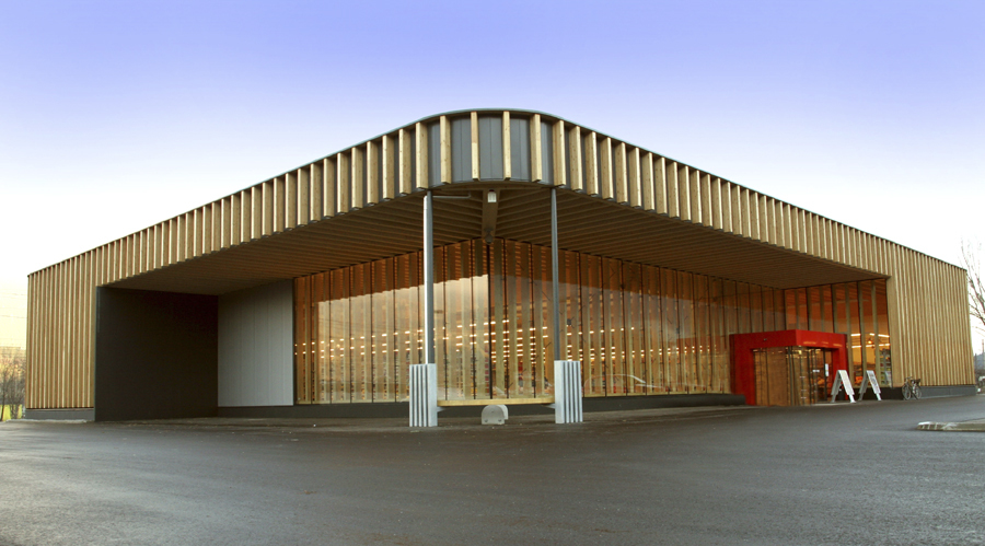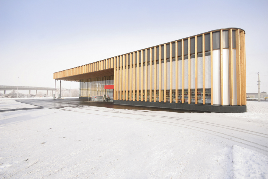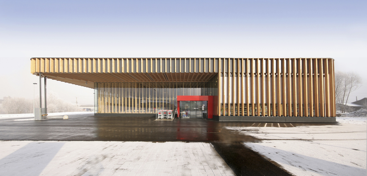 Die mittels Lamellen aufgelöste Fassade gewährleistet ein hohes Maß an Transparenz für den Kunden, von der Seite betrachtet, verschmelzen die Lamellen wiederum zu einem massiven Gebäude. Der gleichbleibende Rhythmus der Lamellen sorgt für Kontinuität rund um das Gebäude sowie seine allseitge Gleichwertigkeit.