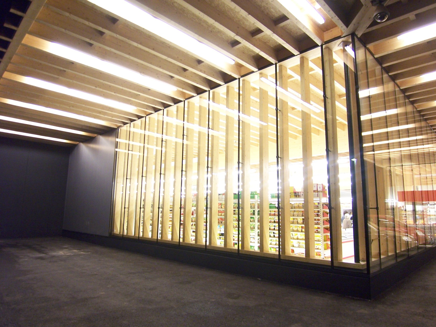Der Innenraum wurde als ein einziger offener Raum konzipiert, lediglich die abgehängte Decke über der Feinkostabteilung akzentuiert und definiert diese als „Raum im Raum“.