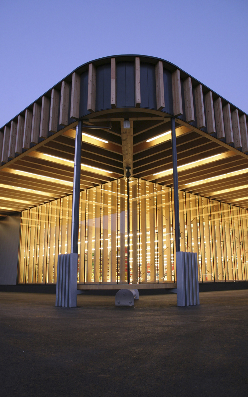 Die tragenden Stützen (BSH Lamellen) sind nach außen gestellt und bewusst gezeigt; sie werden auch im Innenraum als Sekundärträger über die gesamte Dachebene weitergeführt bis sie wieder die Stütze auf der Gegenseite erreichen. (Nach einem Text der Architekten)