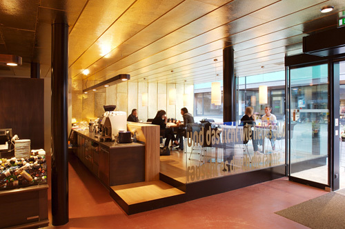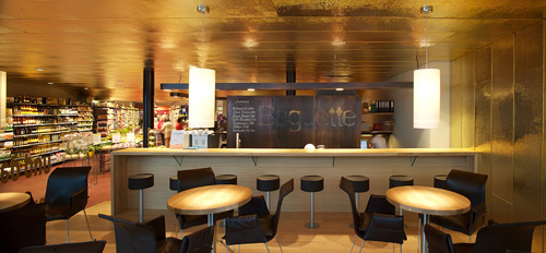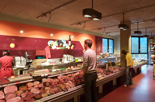 Über das „Baguette“ öffnet sich der Markt mit einer großzügigen Verglasung atmosphärisch zur Kramergasse hin und trägt zur Wiederbelebung des Zentrums bei. Durch den Abbruch der massiven Gemäuer des Blumenladens wird ein großzügiger Eingangsbereich mit dem Café zur Kramergasse möglich, das eine Verbindung von der Straße bis zum sich trichterförmig öffnenden Lebensmittelmarkt bildet. Während die Messingdecke über dem Eingangsbereich und dem Baguette über ihre Atmosphäre zum Verweilen einlädt, wurde im Bereich des Marktes der Rohbeton der Bestandsdecke und der Stützen freigelegt. Zusammen mit dem rotbraunen Boden bildet er einen ruhigen Rahmen für die Waren, die durch die Beleuchtung in Szene gesetzt werden. In den zwei Untergeschossen sind die Personalräume, Technikräume und Lagerflächen des Marktes sowie eine Tiefgarage untergebracht. (Text: Architekten)