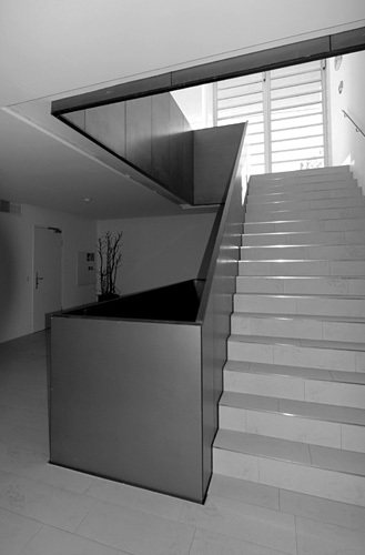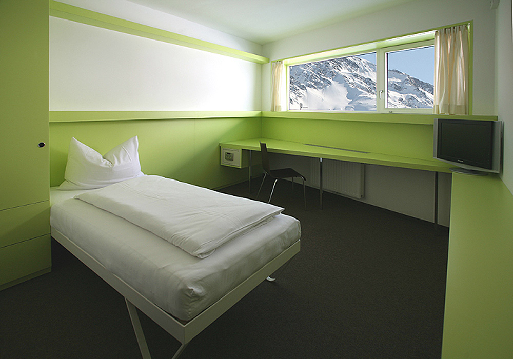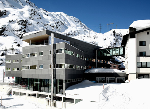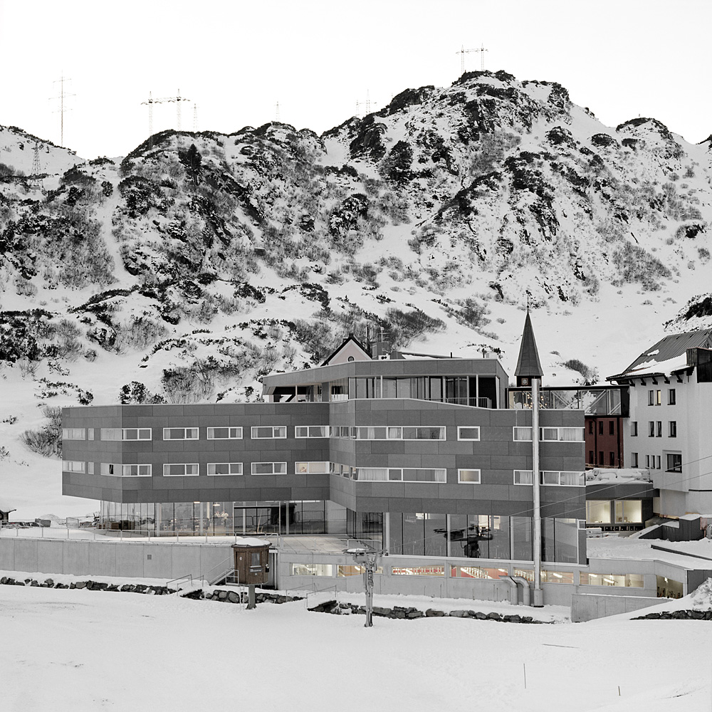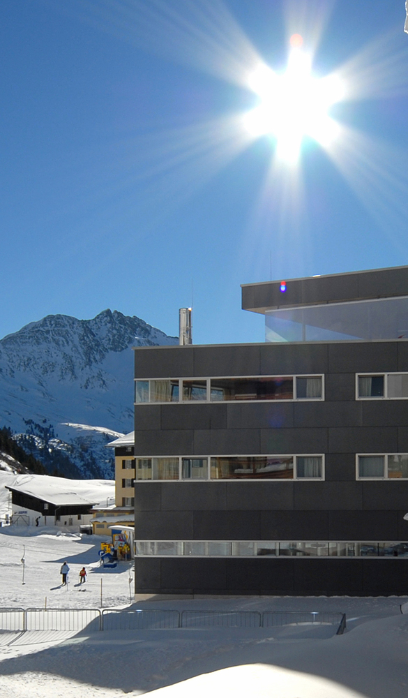 In den beiden Obergeschossen sind die Gästezimmer um eine zentrale, natürlich belichtete Erschließungszone angeordnet. Breite, zum Teil über Eck laufende Fenster bieten den Gästen Ausblicke in die beeindruckende Schneewelt des Arlbergs. Im Dachgeschoss befindet sich der Sauna- und Wellnessbereich, der sich mit einer überdachten Terrasse in die winterliche Bergwelt öffnet. Eine Brücke im Dachgeschoss verbindet den Neubau mit dem bestehenden Altbau.
