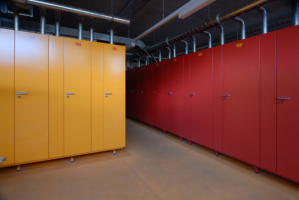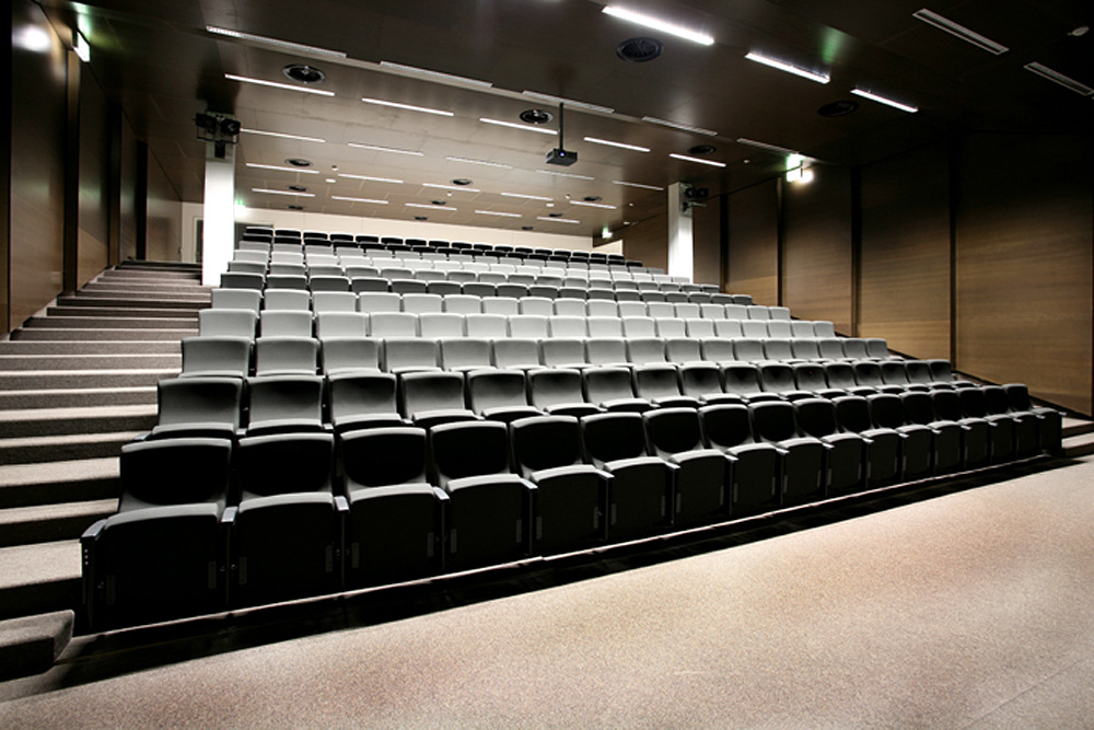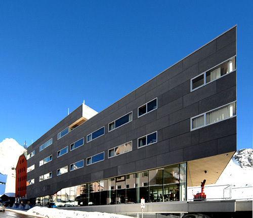 Das erste Untergeschoss ragt durch die leichte Hanglage in Richtung Süden und Osten aus dem Gelände heraus. Dadurch wird einerseits ein direkter, ebenerdiger Zugang vom Schiraum mit Schiverleih und Schipräparation zur Piste möglich, andererseits können die Küche sowie die hauseigene Wäscherei natürlich belichtet werden. In diesem Geschoss sind weiters Seminarräume und eine Bibliothek untergebracht, denen ein großzügiger Aufenthaltsbereich vorgelagert ist. Eine breite Treppe ist direkt mit der Eingangshalle im Erdgeschoss verbunden und erschließt nach unten den kinoartigen Seminarsaal mit 180 Sitzplätzen im zweiten Untergeschoß. Ebenfalls ins zweite Untergeschoß verlegt sind die Lagerräume und eine Tiefgarage. (Text: Claudia Wedekind nach einem Text des Architekten)