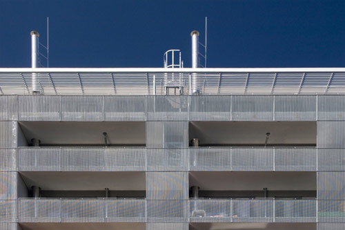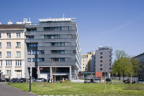 Die Architekten Peter Nigst, Horst Gaisrucker und Markus Lang setzten auf eine auflösende Durchbrechung des Systems der Blockrandbebauung und in der Versetzung der zwei Baukörper zueinander auf dessen Variation, um das Blockinnere zum Straßenraum und den Grünflächen hin zu öffnen und zugleich die Freiräume des Kindergartens zu ermöglichen. Das Verhältnis zwischen Zurückgezogenheit ins Wohnen und Öffentlichkeit des Straßenraums wird durch eine von der Stromstraße und dem gegenüberliegenden Winarsky-Hof so weit wie mögliche Absetzung des Längstraktes balanciert. Von oben gesehen nimmt sich die Setzung aus wie ein Spiel mit Formen aus dem Baukasten, die sich nicht drängend aneinanderschieben, sondern auf ihren Sicherheitsabstand achten. Die metallbespielten Straßenseiten nehmen das auszutarierende Verhältnis zwischen privat und öffentlich ebenfalls auf und setzen mit ihren horizontal komplett durchlaufenden Bändern aus verzinkten Eisen-gitterrosten auf transparente Halbbeschattung. Beide Bauteile sind in ihrer straßenseitigen Gesamtheit in durchbrochene Metallvorhänge gehüllt, dahinter sind die Flächen des Hauses reibungslos, glatt. Eine durch den Wechsel von Loggien und Raumnischen bestimmte Zone ist den südseitig bzw. südostseitig orientierten Wohnungen vorgelagert. Der warme Farbton der inneren senkrechten Loggientrennungen kontrastiert mit der kühlen Härte des Metalls. Sonnenschutzelemente im Dachgeschoss korrespondieren mit den silbernen Metallvorhangbändern. Die hofseitigen, nach Nordwesten orientierten Fassaden führen die Sprache der straßenseitigen Bänder mit anderen gestalterischen Mitteln fort, die Fenster sind zu Fensterbändern gefasst, die zum Garten orientierte freie schräge Stirnfassade des Traktes an der Stromstraße hat größere bandartige Fenster. Um eine optimale innere Lichtführung zu erzielen, setzt die Anordnung der Wohnungen auf das Bausteinprinzip.