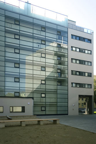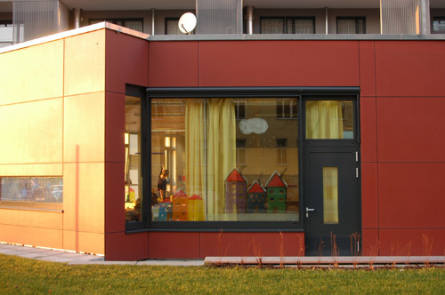 An die siebengeschoßig in die Höhe ragende Längsfront schmiegt sich der dreiteilige, karminrot leuchtende Vorbau des Kindertagesheims, er wurde unter das Haus hineingeschoben, springt lichtsuchend vor. Die Farbwahl ist ein Signal. Hier wird unter schwierigen Bedingungen räumliche Durchlässigkeit hergestellt. Der Raumverlauf für insgesamt 80 Kinder in Kinderstubengruppen wie Kindergruppen ist in drei voneinander abgesetzte Raumteile aufgesplittet, die mittels glasüberdachter Tunnel direkten Zugang zu den vor ihnen liegenden Grün- und Freiflächen haben. Zwei bewachsene Innenhöfe, die Möglichkeit, von Anfang bis Ende einen Quereinblick und Querausblick durch alle Kindergartenräume hindurch zu haben und der direkte Ausblick wie Zugang zu dem vor ihnen liegenden Wiesengrün schaffen für die Kinder räumlich starke, ganz selbstverständlich zu gebrauchende Möglichkeiten.