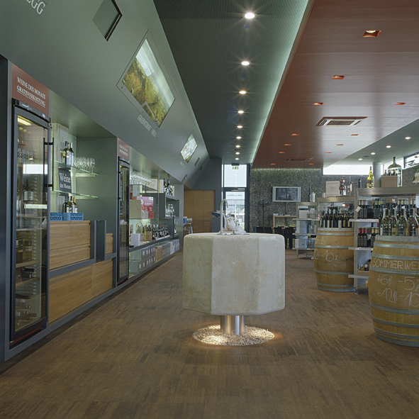 Auftakt zu Weinkult(ur) ist eine auffallend lange, hervorstechende Glasvitrine beim gedeckten Zugang, der zugleich auch die Büros im Obergeschoss erschließt. Der Verkaufsraum wurde in zwei Zonen geteilt - in eine gekühlte für das Weinangebot und eine für Degustation und Verkauf. Die Materialien, ihre Oberflächenhaptik wie auch die Farben zielen auf die atmosphärische Aufrüstung der professionellen Verkaufsstrategie ab. Naturstein mit gespaltener Oberfläche wechselt mit geöltem Eichenparkett, Wandflächen, ausgeführt in Waschbeton, ergänzen furnierte oder grau beschichtete Platten. Schlichte mäandernde Regalablagen mit gebürsteter Edelstahloberfläche werden durch hinterleuchtete Flächen aus satiniertem Glas edel inszeniert. Wenige gedämpft-farbige Akzente wie der abgehängte Deckenstreifen, der Belüftung und -leuchtung verbirgt, unterstreichen das Ambiente. (Text: Karin Tschavgova)