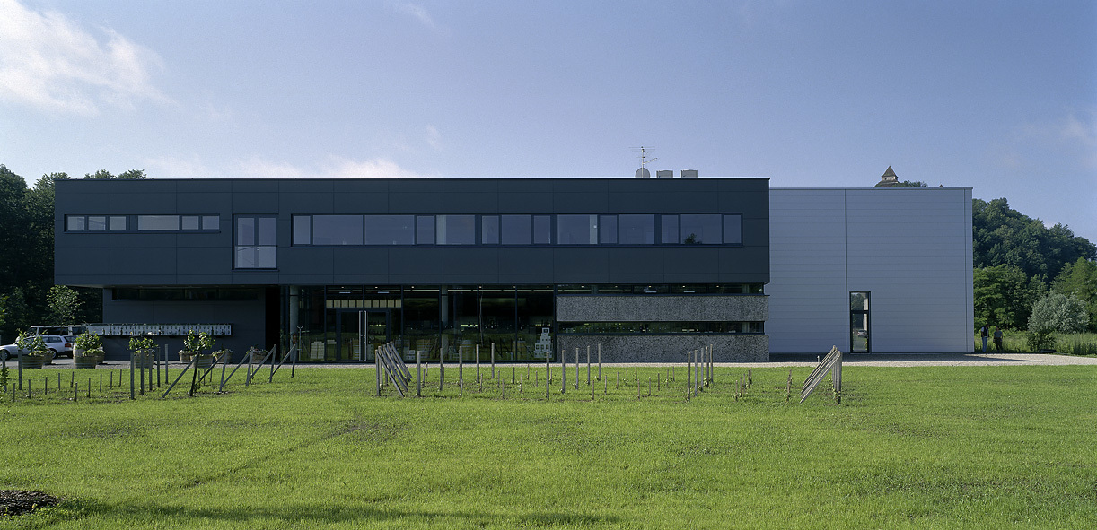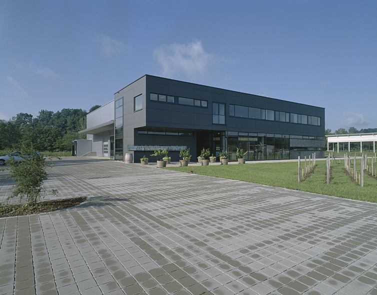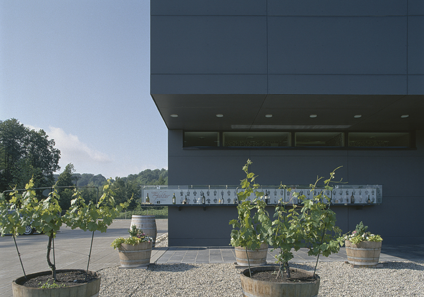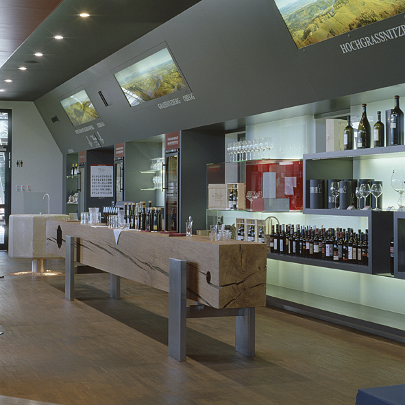 Ursprünglich hatten die Brüder Polz, die nicht nur zu den Spitzenwinzern der Südsteiermark, sondern auch zu den Pionieren eines neuen baukulturellen Bewusstseins im Bereich der Weinvermarktung zählen, lediglich vor, ein verkehrsgünstig gelegenes Sammeldepot als Auslieferungslager zu errichten, um großen Transportern die aufwendige Fahrt zu den Winzern der Weinstraße zu ersparen. Geworden ist daraus ein modernes, 1.700 Quadtratmeter großes Logistikzentrum mit Lager für 750.000 Flaschen, Vinothek und Shop für Weine und andere Produkte der Region. Zugeständnisse an Erwartungen an ländliche Rustikalität beschränken sich auf weniges im Verkaufsraum: auf einen alten Pressbaum, der zum Verkaufspult wurde und Eichenfässer als Präsentationsflächen für Weine.Kühle, funktionell betonte Schlichtheit, die den Bau dominiert, zeigt sich schon an der Fassade aus Eternitverkleidung und Beton in einheitlichem Anthrazit. Der Gebäudeteil zur Straße setzt sich durch einen Vorsprung, durch Zweigeschossigkeit und die Verglasung des im Erdgeschoss situierten Verkaufs von der Lagerhalle ab. Die ist mit großen Toren zu öffnen, mit LKW befahrbar und mit dem Handlager und Shop über zwei Türen verbunden.