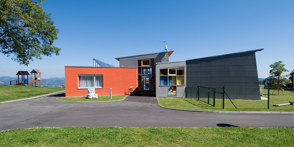 Der südliche Bauteil ist als KLH-Holzkonstruktion mit viel Glas und Sonnenschutz errichtet, der nördliche Teil als Ziegelbau; beide Teile sind mit erhöhter Wärmedämmung versehen. Der Kindergarten wurde als Niedrigenergiegebäude mit einem Energiebedarf von ca. 40 kWh/m²/Jahr geplant. (Text: Herbert Missoni)