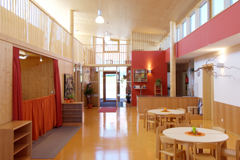 Zwischen den beiden Bauteilen befindet sich die Aufschließungszone, ebenso vom Süden über das Oberlichtband besonnt, die so konzipiert ist, dass sie als kleine Halle als Spielraum, aber auch als Speiseraum neben der Küche Verwendung finden kann, wenn - wie zu erwarten - in Zukunft der Ganztags-Kindergarten gebraucht wird. Sie steht auch für gemeinsame Feste der Kinder, für Konzerte und für Theaterspiel zur Verfügung. Zum Spielgarten hin, nach Süden, ist den Gruppenräumen eine geräumige Holzterrasse mit Überdachung vorgelagert, die in der Übergangs- und Sommerzeit den Aufenthalt im Freien ermöglicht.