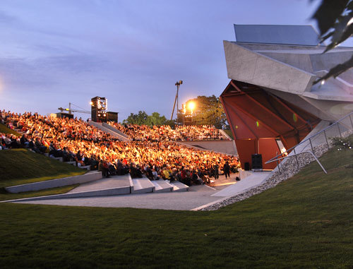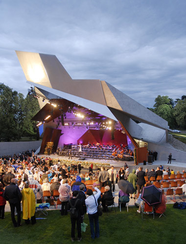 Überhöht von einem Bühnendach aus Stahl und Glas steigert der Pavillon nicht nur das akustische Empfinden der Zuhörer, sondern wohl auch deren Augensinn. Die bewegte Skulptur über vollem Orchester lässt dann vielleicht eine Metapher Arthur Schopenhauers anklingen, in der Architektur bekanntlich als „gefrorene Musik“ bezeichnet wird. Wo könnte diese Metapher besser passen als hier? (Text: Gabriele Kaiser)