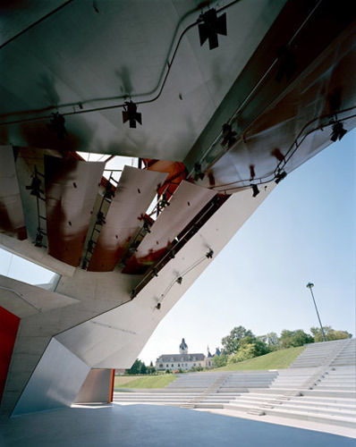 Mit einer Höhe von 23 Metern blitzt die Spitze der Stahl/Glaskonstruktion des Bühnendaches von vielen Blickpunkten des Parks immer wieder zwischen den Baumkronen hervor und verschafft sich in der „Schneise“ zwischen Reitschule und schwarzem Tor maximale Präsenz. Ausgehend von den akustischen Grundregeln für eine Bühne im Freien (1670 Tribünenplätze, 300 Rasenplätze) wurden „Affinitäten zwischen perspektivischem und akustischem Raum untersucht“. Durch starkes Modellieren des Geländes neben der bereits vorhandenen „Senke“ wurde der Zuschauerraum in ein Becken eingesenkt, das trotz seiner geometrischen Raumgrenzen wie selbstverständlich in der Wiese liegt und für beste Sicht- und Klangbedingungen sorgt. (Aber auch außerhalb der Konzertsaison und ohne Bestuhlung wird man sich in diesem „Freiluftbecken“ vermutlich gerne aufhalten.) Im Inneren des Wolkenturms sind hinter der 228 qm großen Klangmuschel der Bühne die Aufenthalts- und Sanitärräume der Künstler, ein Klavierdepot, Technikräume und Akustikschleusen angeordnet, ein geräumiger Bühneneingang ist dem separaten Auf- und Abtritt der Künstler gewidmet und ermöglicht den reibungslosen An- und Abtransport der Instrumente. Das Bühnenbauwerk wurde in Stahlbeton errichtet, die Bühnentrennwand in doppelschaliger Leichtbauweise, die Tribüne aus Betonfertigteilen.
