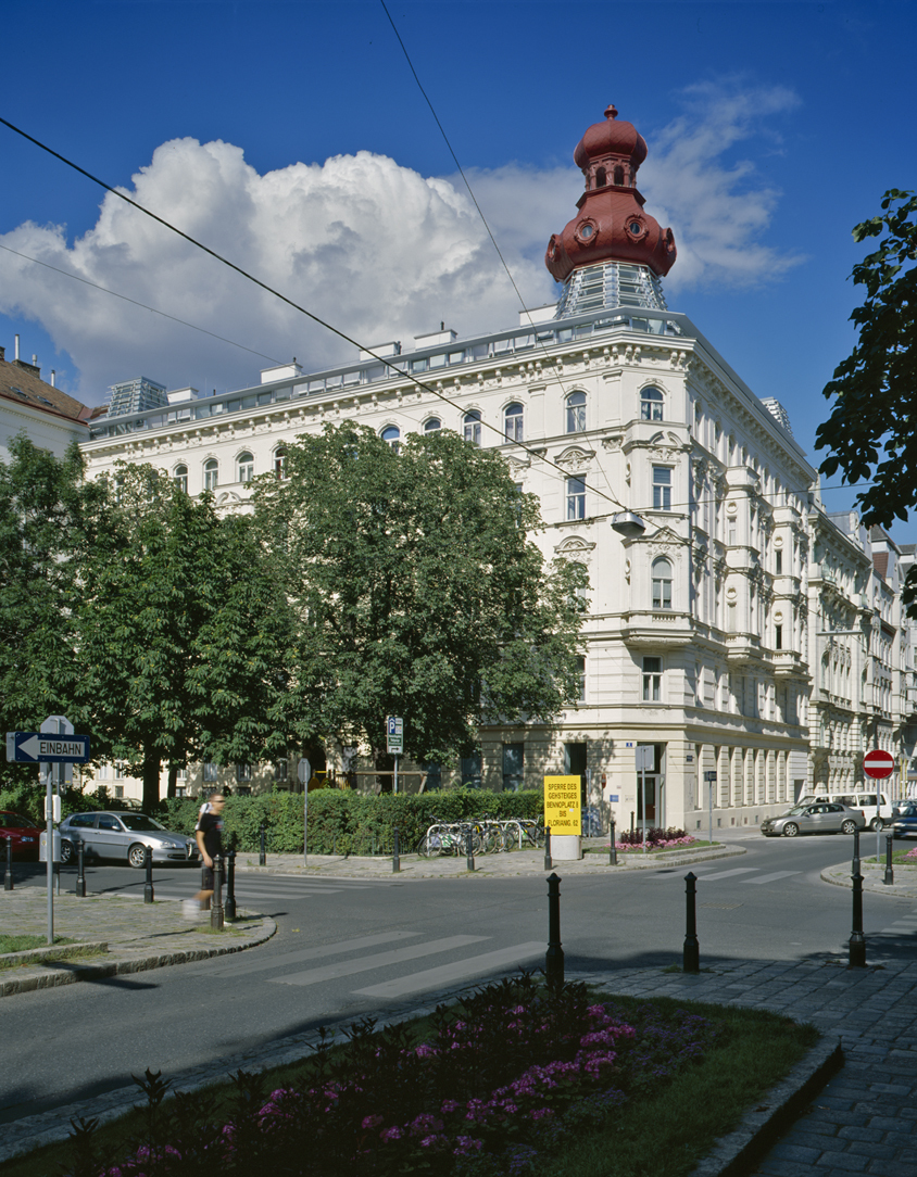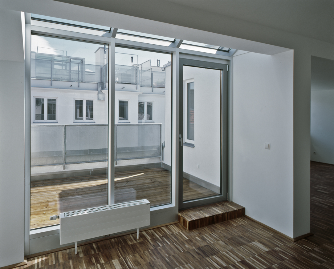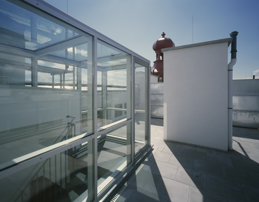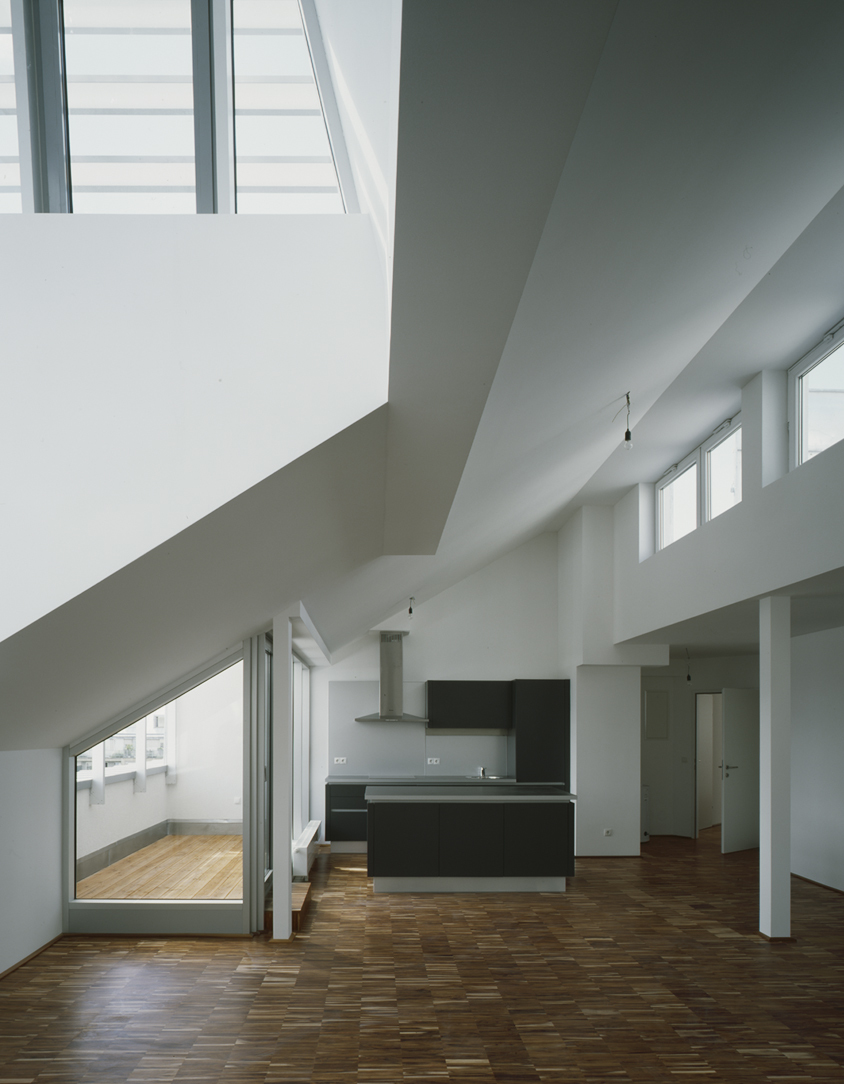Über dem gesamten Dachgesims schwebt ein Band aus Aluminium, das die Oberkante der ehemaligen Attika aufnimmt und somit die Originalkubatur des Gebäudes in seiner Schutzzonenlage unverändert lässt. Die Loggien und Balkone der sechs Wohnungen liegen eingeschnitten hinter dem Band, ihre Sonnenschutzkonstruktionen ergeben mit den restlichen Dachflächen eine einheitliche Linie. Die ausgetüftelt entwickelten Grundrisse mussten zwar durch unvorhergesehene Eingriffe von Seiten des Bauherren teilweise an Klarheit einbüßen, dennoch entstand hier eine in jeder Hinsicht vorbildliche Lösung der schwierigen Bauaufgabe. (Text: Marion Kuzmany)