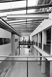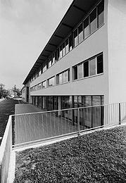 Die Südhälfte des Neubaus enthält in 3 Etagen Klassen und Werkräume, der Nordteil, mit eigenem Abgang, den ins Souterrain versenkten Turnsaal. Darüber liegt der Saal des örtlichen Ringervereins. Die Garderoben unter dem Vorplatz sind durch Glaskuppeln belichtet. (Text: Otto Kapfinger in „Baukunst in Vorarlberg seit 1980, Hrsg. VAI / KUB“)
