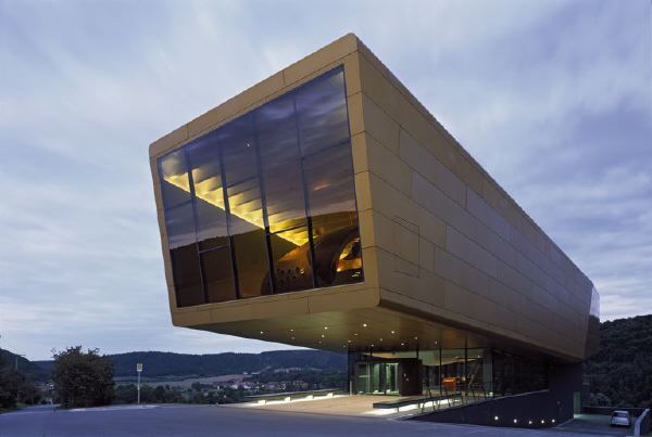 Wie eine echte Arche liegt der Bau der Zürcher Architekten Barbara Holzer und Tristan Kobler auf halber Hanghöhe quer im waldigen Tal der Unstrut: ein für grosse Kapazitäten gedachtes, fremdes Volumen in der kleinräumigen Flusslandschaft zwischen dem Städtchen Nebra und der ottonischen Kaiserpfalz von Memleben. Statt «Arche Nebra» müsste dieses Besucherzentrum am Rand des Mittelberges, auf dessen Gipfel vor 3600 Jahren die heute weltberühmte bronzene Himmelsscheibe vergraben wurde, dennoch eher «Barke Nebra» heissen. Denn das Gebäude dient nicht wie die Arche Noah einer Rettung der Tierwelt vor einer Sintflut, sondern der unterhaltsamen Präsentation von archäologischem, astronomischem, religionsgeschichtlichem und kriminalistischem Wissen über das sensationelle prähistorische Objekt - und auf diesem ist ausser einem Vollmond, einer Mondsichel sowie dem Siebengestirn der Plejaden auch eine Barke dargestellt, wie man sie aus der Bronzezeit des Nordens als religiöses Symbol kennt. An das Motiv der goldenen Barke wird sich fast jeder, dem die Himmelsscheibe von Nebra vor Augen steht, beim Anblick des betont bildhaften Baus von Holzer Kobler erinnern. Er gliedert sich in drei horizontal übereinandergeschichtete Zonen: einen dunkel verputzten Betonsockel, ein zurückgesetztes verglastes Foyer mit Café im Erdgeschoss und darüber ein sechzig Meter langes, tal- wie hangseitig stark auskragendes balkenartiges Obergeschoss mit einer Verkleidung aus mattgolden eloxierten Aluminiumplatten. Nahe seiner Mitte ist dieser dominante Teil des Baus leicht nach unten eingeknickt und etwas verbreitert. Innen findet man an der Knickstelle ein kleines Planetarium für astro-archäologische Sternenreisen, an das sich talseitig ein schöner Raum für Sonderausstellungen und hangseitig das Treppenhaus mit Blick in den Himmel sowie ein Saal für die Dauerpräsentation anschliessen; dieser wird von der Schmalseite her durch ein goldgelb gefärbtes Panoramafenster belichtet, das den Blick zur Fundstelle der Himmelsscheibe auratisiert. Morphologisch erinnert das Gebäude an das Museum Nieuwland in Lelystad (1994) der Amsterdamer Architekten Benthem Crouwel.