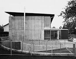 Durch tragende Betonwände in der Querrichtung gegliedert, ist der Bau linear in vier Schichten konzipiert: als „Rückgrat“ eine sehr helle Gangzone (durchgehendes Oberlicht) und darüber der schmälere Laubengang für die Wohnungen, nordwestlich davon im EG die mit dunklem Eternit verkleideten Boxen der Garderoben und Neben-räume, südwestlich alle Haupträume, vollflächig zum Garten verglast, samt gedeckten, beschatteten Übergangsbereichen. Ein kompakter Typus, von den Böden bis zum abgesetzten Pultdach in Material und Details elegant und robust. (Text: Otto Kapfinger in „Baukunst in Vorarlberg seit 1980, Hrsg. VAI / KUB“)