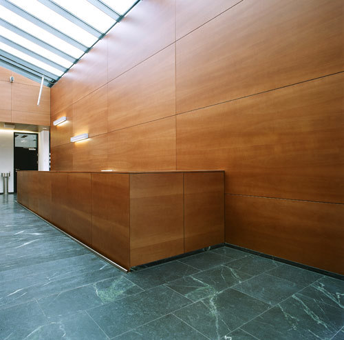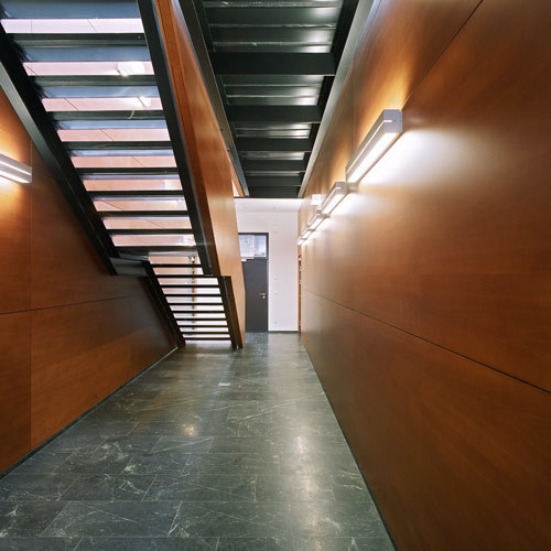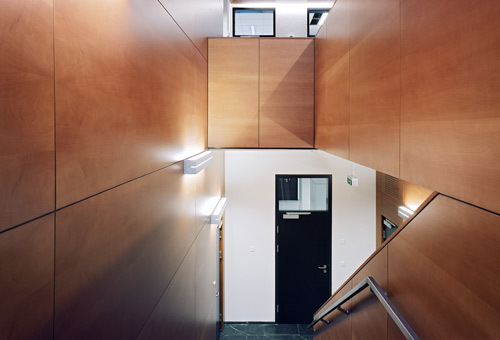 Die großzügige und helle Mitte des Gebäudes definiert ein von oben belichtetes und mit Birnenholz bekleidetes Stiegenhaus, zusätzlich verfügt die ÖBB-Belegschaft über zwei überdachte Höfe und weitere Zugänge auf Ebene der Gleisanlagen. In seiner Materialität (Glas, Nirosta, tauerngrüne Steinböden) strahlt das Personalgebäude jene dezente Noblesse aus, die in der Architektur von Arbeitsstätten in den letzten Jahren mehr und mehr zur Selbstverständlichkeit geriet. (Text: Gabriele Kaiser)