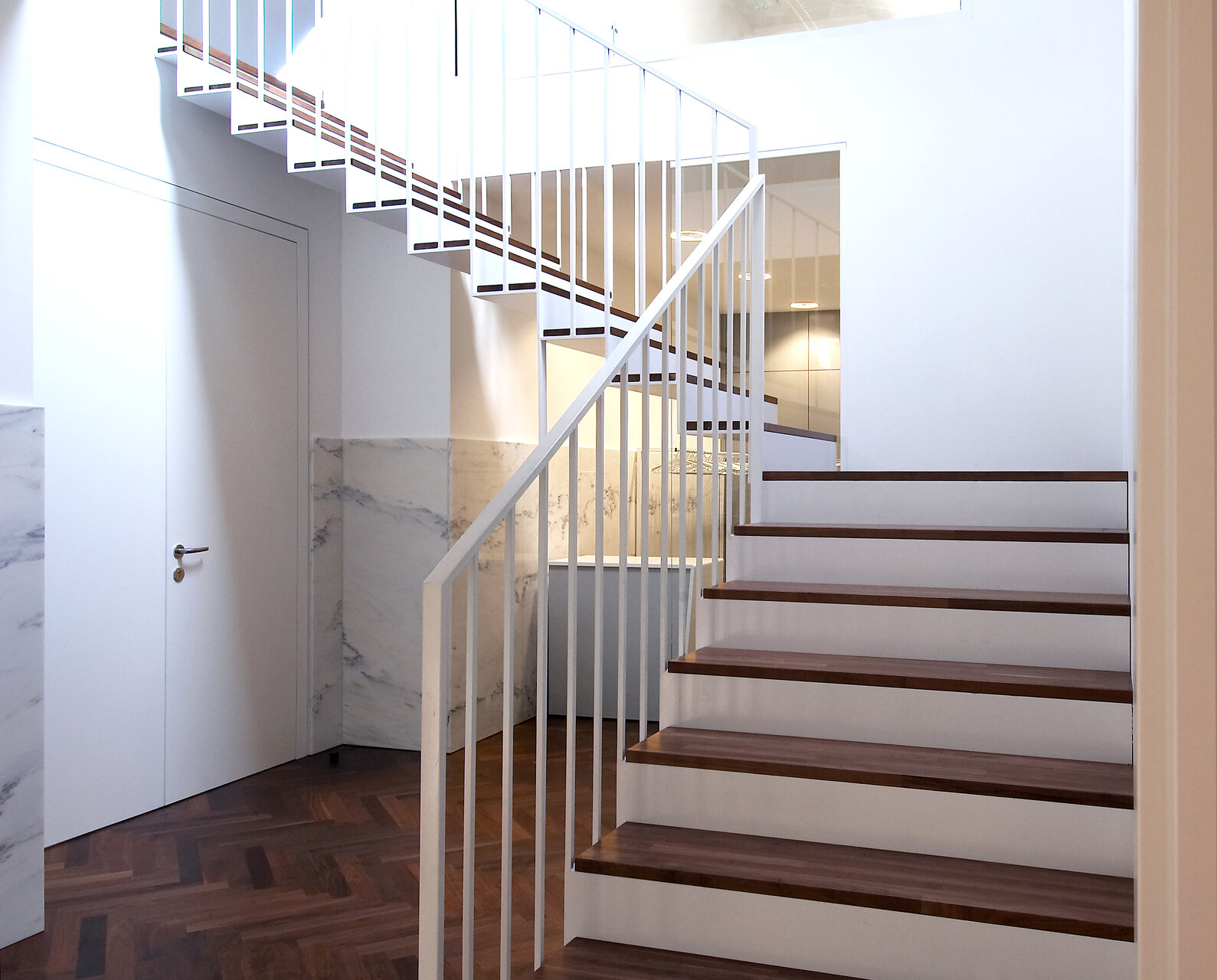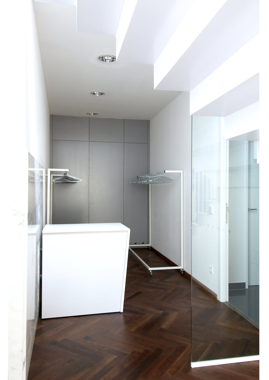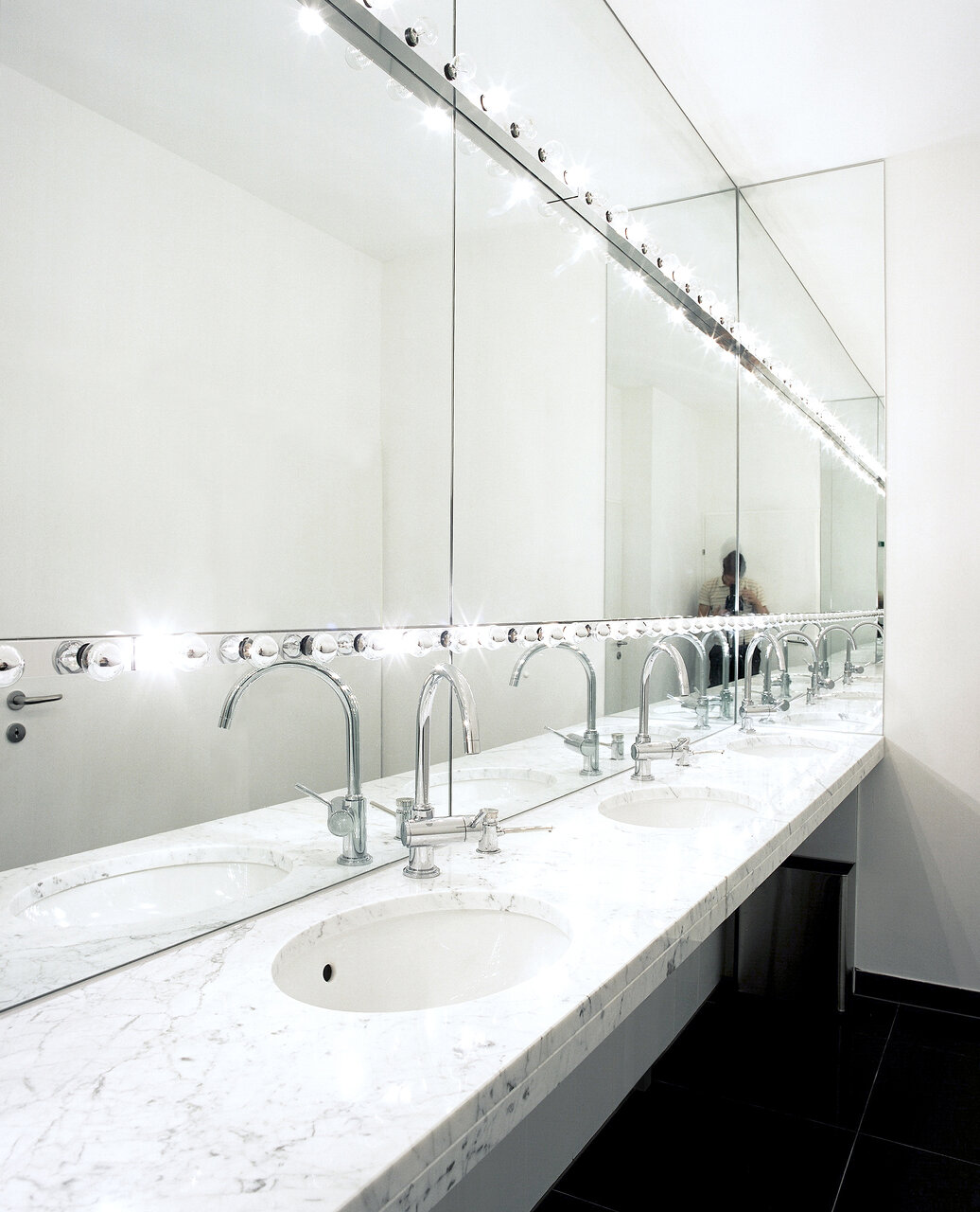 Das dezente Farbkonzept in Weiß und Grau sorgt für ein nüchternes, neutrales Ambiente. Da die Affinität zu „bleibenden Werten“ in diesem Kontext nicht verfehlt ist, kamen hochwertige Materialien wie Marmor, lackiertes Glas, Nussparkett und Stahl zum Einsatz. Den flüchtigen Freuden von Gestaltungsmoden wollte man sich hier gewiss nicht hingeben... (Text: Gabriele Kaiser)