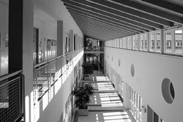 In den Details eher derb, ist der südwärts geöffnete, schlichte Hoftypus mit der innen umlaufenden, zweigeschossigen Erschließungshalle und der vorgelegten Arkade eine ungemein großzügige, robuste und vielfältig nutzbare Lösung, die spontan anspricht und einen adäquaten Übergang zum anschließenden Landschaftsraum darstellt. (Text: Otto Kapfinger in „Baukunst in Vorarlberg seit 1980, Hrsg. VAI / KUB“)