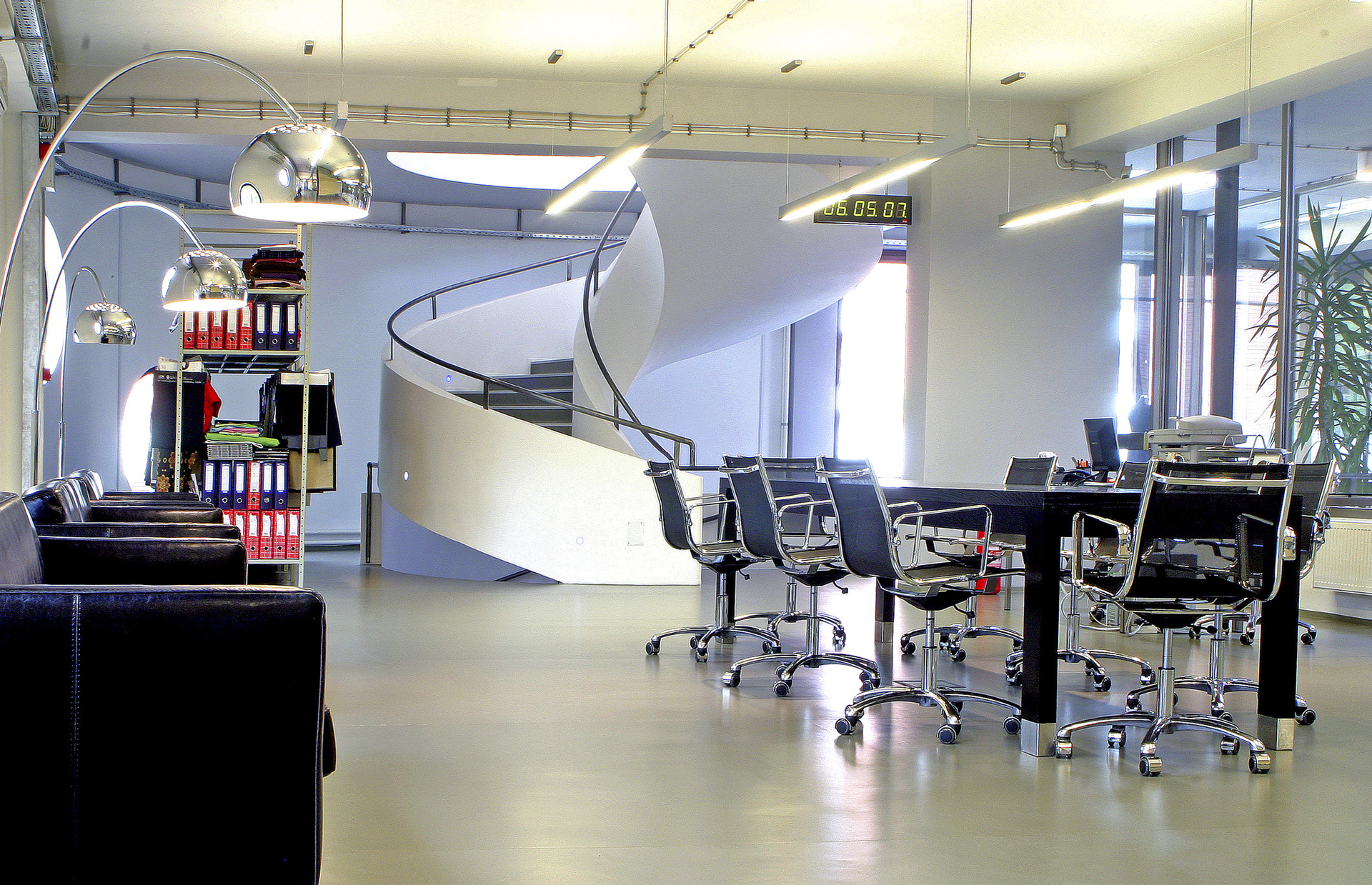 Although the old structure has been completely absorbed by the new, it is clearly defined by rectangular columns and visible beams, whilst the new structure utilises stronger floor slabs, which are supported by circular columns throughout. Two homogeneous, gently coiled concrete staircases, connect the ground floor reception area with the upper floor offices. These are the focal point of the public area. The colour concept is one of contrast, alternating between black and white: a black façade, white interior walls and industrial flooring. The surface of the façade is made of finely ground marble. Measures had to be taken to forestall cracking in the façade by the marble overheating. Movement joints were incorporated and the black surface has been brightened by adding a 20% mix of white marble.