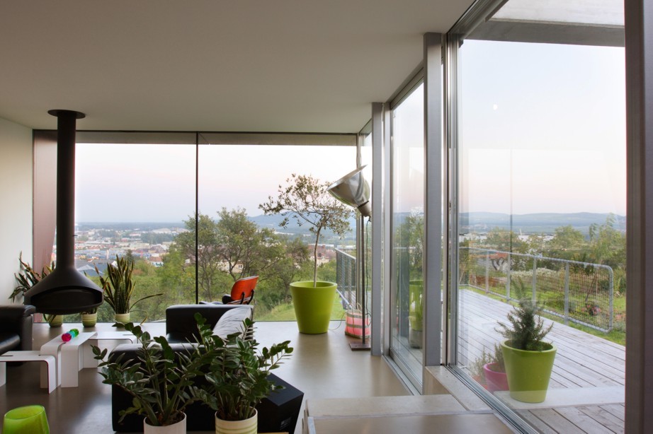 „Das Grundstück war ein richtiger Dschungel“, erinnert sich Connie Herzog an den ersten Besuch vor Ort, „doch diese Herausforderung inspirierte uns. Wir wollten das Gelände ausnutzen und ein Haus entwickeln, in das man ebenerdig hinein, in dem man aber auch von jedem Raum ins Freie kann.“ Ganz klar musste sich das Haus nach Süden hin öffnen, wo sich das schillernde Band der Donau am Stift Göttweig vorbei durch die Landschaft schlängelt. „Das Panorama ist sensationell“, schwärmt die Architektin.