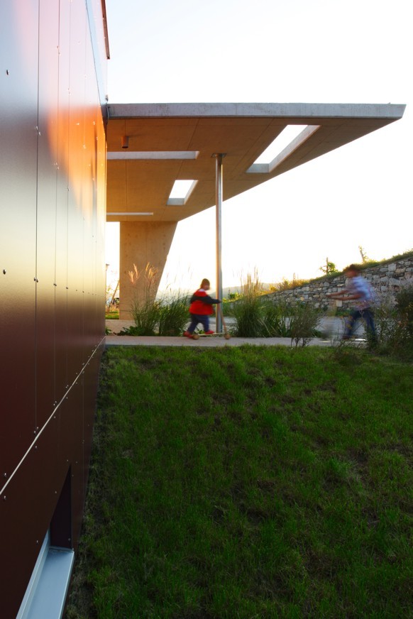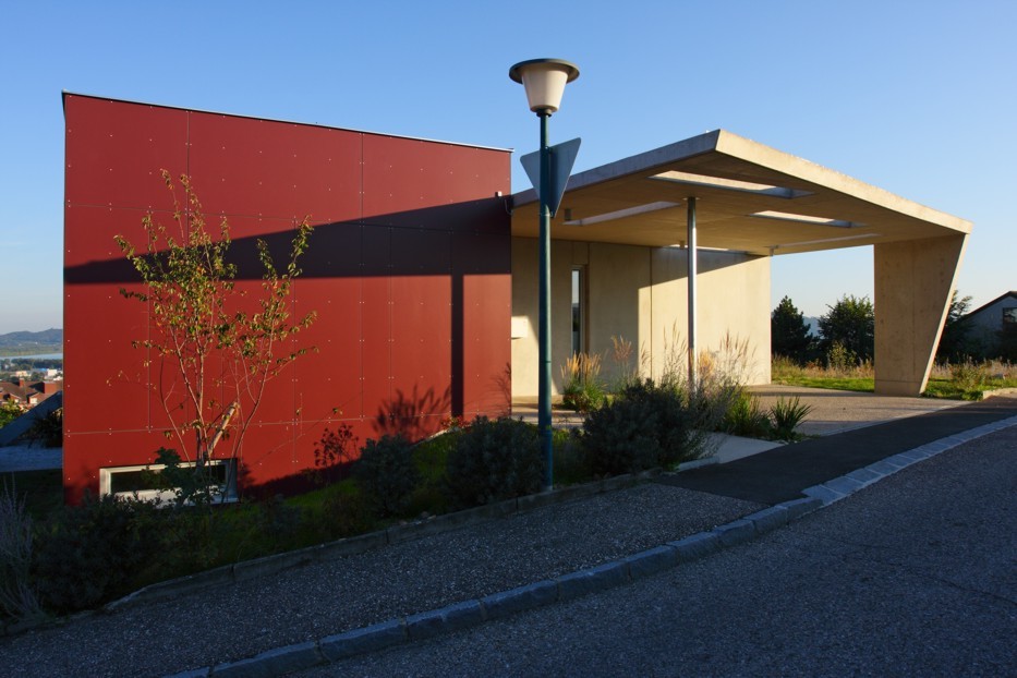 Gewohnt wird im langen, dunkelrot verkleideten Bauteil, der über dem Kellersockel aus Sichtbeton die Hangkante entlanggleitet. Schon im Vorraum weitet sich ahnungsvoll der Blick übers Tal. Am Eingang liegt die Praxis der Baufrau. Von der überaus praktischen Küche neben dem Wohnbereich führen in der Mitte Stufen hinab zu einem lauschigen Platz an der Morgensonne.