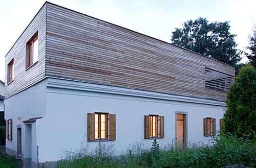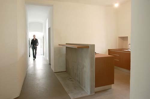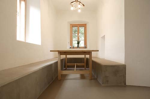 Im Zuge der Aadaptierung wurde auch der Windfang abgebrochen, die verdeckten Graniteinfassungen der Türen freigelegt und die Kastenfenster samt Fensterläden erneuert. Zwischenwände und Türen wurden entfernt und bisher nicht vorhandene Infrastruktur wie Bad, WC, Heizung sowie fixe Möblierung in Sichtbeton eingebaut. Die Unregelmäßigkeit des Bestandes kontrastiert mit den glatten Oberflächen der neu errichteten Elemente und dem durchgehenden Bodenbelag aus grauem Magnesitterrazzo. „Das seit mehreren Generationen in Familienbesitz befindliche Haus“, so die Architekten, „blieb mit all seinen emotionalen Bezügen der Auftraggeber erhalten aber gleichzeitig wurde den völlig geänderten Bedürfnissen und den zeitgemäßen Ansprüchen Rechnung getragen.“ (Text: Gabriele Kaiser)