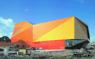 Die Typologie des Theaters ist an sich schon faszinierend. Ben van Berkel jedoch, den es immer auch interessiert, wie ein Gebäude mit den Menschen »kommuniziert«, wollte die (darstellerischen) Merkmale und Möglichkeiten von Theatern und der Architektur im Allgemeinen weit über das einfache »Funktionieren« hinaus nutzen. Die komplexe äußere Hülle entstand in diesem Fall zum Teil auch durch die Vorgabe, die zwei Hauptsäle aus akustischen Gründen so weit wie möglich voneinander entfernt anzuordnen. Folglich wurden ein größerer und ein kleinerer Saal, der Bühnenturm, mehrere eigenständige, aber miteinander verbundene Foyers, zahlreiche Umkleiden und Mehrzweckräume sowie ein Café und ein Restaurant alle innerhalb eines großen Volumens untergebracht, das sich geradezu dramatisch in unterschiedliche Richtungen erstreckt. Die überaus komplexe Hülle resultiert aber auch aus dem Wunsch nach einer einheitlicheren Silhouette, da der erhöhte Bühnenturm ansonsten eine visuelle Störung in der Stadt dargestellt hätte. Die Fassaden mit ihren scharfen Winkeln und hervorstehenden Flächen bestehen aus Metallplatten in Gelb und Orangetönen sowie Glas. Die zahlreichen Vorsprünge ermöglichen Orte, an denen das »Zurschaustellen« hinter den Kulissen fortsetzt und die Schauspieler und Zuschauer gewissermaßen ihre Rollen tauschen. Der Aufenthaltsbereich der Künstler befindet sich beispielsweise direkt über dem Haupteingang, so dass diese durch ein großes, geneigtes Fenster das Publikum beobachten können, wie es sich dem Theater nähert.