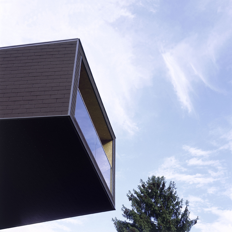 Am deutlichsten zeigt sich diese Strategie der totalen Ausnutzung an der Straße im Norden, wo das Dachgeschoß noch eine konventionelle Satteldachform aufweist - man möchte ja nicht die guten Nachbarschaftskontakte der Eltern gefährden. Doch im allmählichen Umkreisen ändert der Holzleichtbau sukzessive seine Form. Trichterförmig streben die ansteigenden Seitenwände dem raumhohen Panoramaglas des Elternschlafzimmers zu. Das Dach indes verebbt, bis am Ende nichts mehr von ihm zu sehen ist. Stolze vier Meter beträgt die Auskragung an dieser Stelle. Darunter schafft sie Platz für einen gedeckten Freiraum.