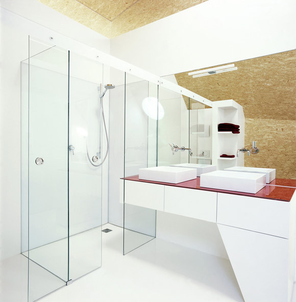 Darüber aber wird es wirklich spannend. „Die Bauordnung erlaubte kein Vollgeschoß, sondern nur einen Dachausbau“, sagt David Birgmann von den x architekten, „der Kniestock lag nur 1,20 Meter über der Rohdecke und so versuchten wir, aus der Dachneigung ein Maximum an Raum rauszuschinden.“
