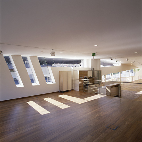 Die Ausstellungsfläche besteht aus 3 verschiedenen aber zueinander offenen Niveaus. Der Zugang über eine Außentreppe liegt somit gerade so hoch, dass das 1. Niveau gut von der Straße einsehbar ist. Die anderen Ausstellungsflächen entwickeln sich nach oben und ermöglichen dadurch genügend Raumhöhe für das darunter befindliche Lager. Vom nächsten Niveau aus ist die gesamte Ausstellungsfläche einsichtig. Hier können auch in Ruhe Verkaufsgespräche geführt werden.