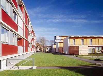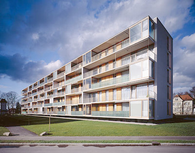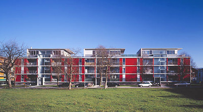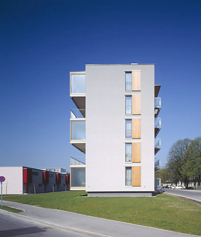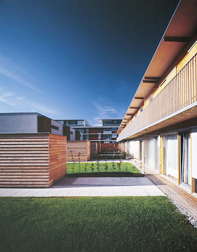Der Nordtrakt hat Etagenwohnungen mit Loggien bzw. Wintergärten nach Süden, erschlossen durch Lifte und Laubengänge mit „leisen“ Streckmetallböden. Der Westtrakt enthält Zweispänner- und Penthousewohnungen, die gereihten Maisonetten sind 4-Zimmerwohnungen mit 10 x 10 m großen Gärten und Grasdächern. Primärstruktur in Stahlbeton und Ziegel, südseitig Holz- und Glaspaneele, vorgehängte Schiebeläden. (Text: Otto Kapfinger in „Baukunst in Vorarlberg seit 1980, Hrsg. VAI / KUB“)