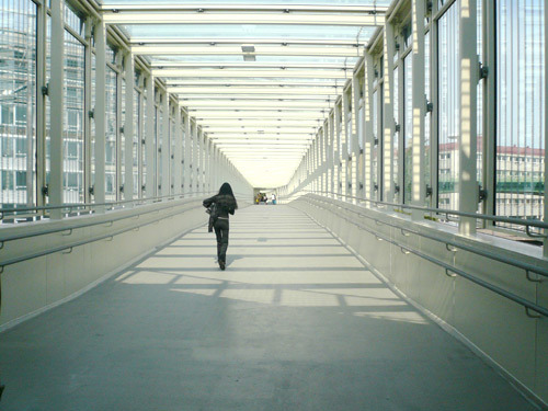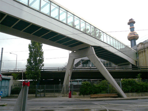 Das Architektenteam Aneta Bulant und Klaus Wailzer, das bereits mit einer Fußgängerbrücke über dem Gürtel neben der Hauptbibliothek eine ähnliche Aufgabe bewältigt hatte, setzte sich in einem europaweiten, offenen Wettbewerb – in Kooperation mit dem Tragwerksplaner Karlheinz Wagner – gegen 46 Konkurrenten, darunter Zaha Hadid und Klaus Bollinger, durch. Ihr Entwurf sieht als Konstruktion einen wannenförmigen Durchlaufträger vor, dessen Seitenwände entsprechend den geforderten Duchfahrtshöhen und statischen Notwendigkeiten unterschiedlich hoch ausgeführt sind. Das Niveau des Bodens folgt im leichten Gefälle seiner eigenen Logik, wodurch sich unterschiedliche Parepethöhen ergeben, während die Dachebene über die gesamte Länge der Brücke von rund 120 Metern auf einer horizontalen Linie verläuft. Zusammen mit den leicht gegeneinander verschwenkten Seitenwänden erzeugt diese Anordnung perspektivische Effekte, die dem Durchgang eine besondere Spannung verleihen. Nach außen verzichtet die Brücke auf angestrengte konstruktive Hochseilakte, die in diesem Kontext völlig unangebracht wären. Trotzdem besitzt sie mit ihrer eleganten Linienführung, die von kleinen, aber präzisen Gesten lebt, eine starke Präsenz im Straßenraum.