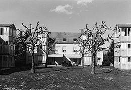 Zweispännertypologie mit plastisch vorspringenden Wintergärten in Holzkonstruktion; Garagenaufgänge in den nördlichen Ecken, ein Fußweg außen rundherum, begleitet von gemauerten Schuppen in der Art früher Werksiedlungen. Vier Platanen beschatten den gut proportionierten Hof und filtern die Sicht zwischen den Häusern. Am Höhepunkt der Postmoderne entworfen, zeigt der Bau eine subtil verfeinerte Sprache des Alltags und bietet - mehr als ein Dutzend Jahre in Gebrauch - ein solide detailliertes, vorstädtisches Milieu. (Text: Otto Kapfinger in „Baukunst in Vorarlberg seit 1980, Hrsg. VAI / KUB“)