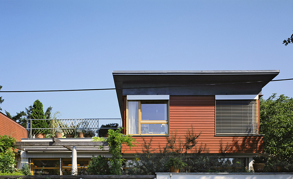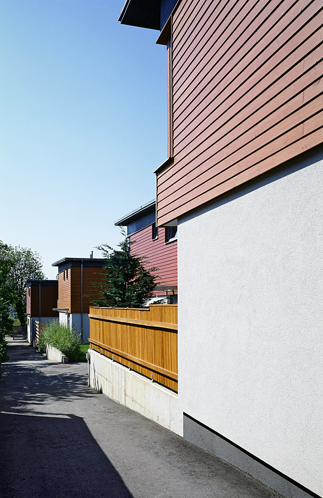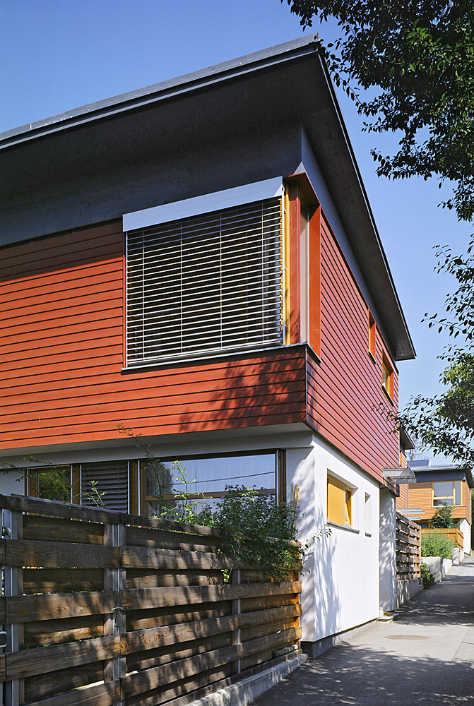 Die kleine Siedlung liegt in einem ausgedehnten Einfamilienhausquartier nordöstlich des Ortszentrums. Das schmale und tiefe Grundstück weitet sich nachhinten etwas auf. Dies wird mit der geschickten Staffelung der vier gleichen südorientierten Häuser entlang der am rechten Rand verlaufenden Zufahrt genutzt, sodass der Eindruck einer ungezwungenen Gruppe entsteht. Damit wird siedlungsbaulich eine strukturelle Verwandtschaft zur umgebenden vorstädtischen Bebauung erzielt. Alle vier Häuser verfügen über einen privaten Gartenhof, der aus dem Hauptwohngeschoß über Wohnraum, Küche oder einem Zimmer direkt zugänglich ist. Das etwas kleinere Obergeschoß ist als Holzleichtbaukonstruktion auf das massive Erdgeschoß aufgesetzt. Die innere Einteilung konnte noch in einer späten Bauphase mit den künftigen Eigentümern festgelegt werden. Horizontal verschalte Außenwände weisen einen farbigen Anstrich auf, zusätzlich werden sie von einem Vordach geschützt. Sonnenkollektoren auf dem Dach sorgen für die Warmwasseraufbereitung. Trotz knappem Platz und ebensolchem Budget gelingt es, dank differenzierender Planung, mit Verdichtung, Variation, baulicher Flexibilität und positiver Anmutung, sowohl für die ganze Siedlung, als auch in den einzelnen Häusern Individualität und hohen Wohnwert zu schaffen. (Text: Walter Zschokke)