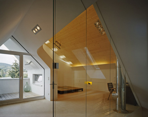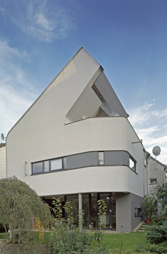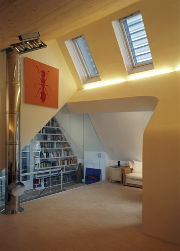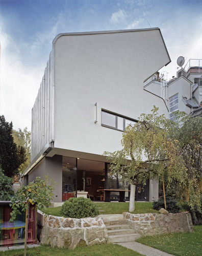 Ohne „innere Berührung“ wurden auf drei Geschossen Alt und Neu zu einer neuen Einheit verbunden. Die alte Fassade blieb auch im Inneren als Fassade erhalten, Fenster können in den gemeinsamen Zwischenraum geöffnet werden, der einstige Balkon leistet nun als Lesecorner beste Dienste. Der neue Baukörper reagiert stark auf die Umgebung. Im Erdgeschoss ist die Wohnküche durch große Schiebetüren mit dem Garten verbunden. Im Mittelgeschoss finden die Rückzugsräume Platz, während das Dachgeschoss den Eltern einen Bereich reserviert, der als zweites Wohnzimmer und Schlafzimmer zugleich fungiert. Die dramatisch hohe Raumkubatur entsteht aus einer Konstruktion, die gefiltertes Westlicht scheinbar über das viel zu große, am Rande der Legalität dimensionierte Nachbarhaus einfängt. Inspiriert nicht zuletzt auch von der Kunstsammlung der Bauherrn sollte eine außergewöhnliche Lichtführung auf weißen Flächen die räumliche Wirkung steigern. Der von außen kompakt wirkende Baukörper scheint durch statische Wirkung des Mittelgeschosses auf einer einzigen dünnen Stütze geradezu zu balancieren. Die Baumasse löst sich nach oben hin in Scheiben auf, die Giebelmauern werden von massiven Holzelementen überspannt, in einer Schräge, die dem Nachbarn und nicht zuletzt dem eigenen Garten möglichst viel Licht lässt. Auch der Grundriss reagiert um den wertvollen Start der Nachmittagssonne im Garten nach vorne zu verlegen. (Gabriele Kaiser nach einem Text der Architekten)