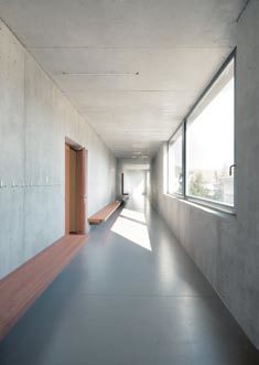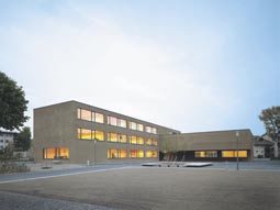 Das Schulhaus Eichhölzli in Glattfelden ist ein typisches Landschulhaus aus den Sechzigerjahren: grauer Putz und Beton, etwas Sichtbackstein und darauf ein flach geneigtes Satteldach. Die Turnhalle folgte etwas später und versuchte, sich mehr schlecht als recht an das Schulhaus anzulehnen. Die jüngste, winkelförmige Erweiterung mit Schulräumen und einer Turnhalle definiert mit dem Altbau einen Hof und schliesst die Anlage gegen das Wohnquartier ab. Architekt Peter Kunz entwarf ein einfaches, kostengünstiges Volumen. Der Klassentrakt zählt drei Geschosse, die angebaute Turnhalle ist zur Hälfte im Boden versenkt. Wer Kunz’ Bauten kennt, für den ist das Schulhaus wie ein umgekehrter Handschuh: Den sonst üblichen Beton sucht man am Äussern vergeblich; ein brauner Putz überzieht die Fassaden. Im Innern jedoch ist er wieder präsent, der Sichtbeton an Boden, Decken und Wänden der Korridore. In frischem Kontrast dazu steht die farbliche Gestaltung von Jörg Niederberger, die mit einem kräftigen Orange in der offenen Vorhalle beginnt. In jedem Geschoss zeigen die Zimmer eine andere Farbe.