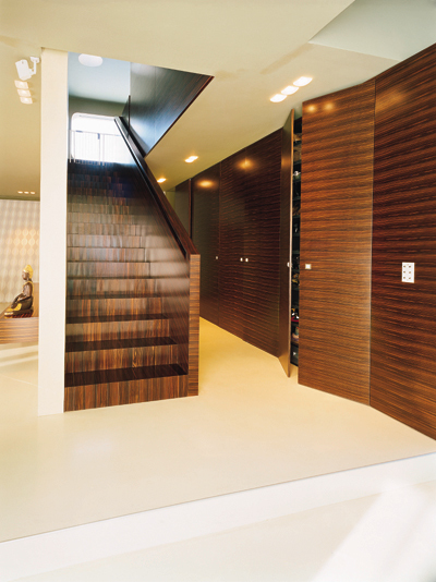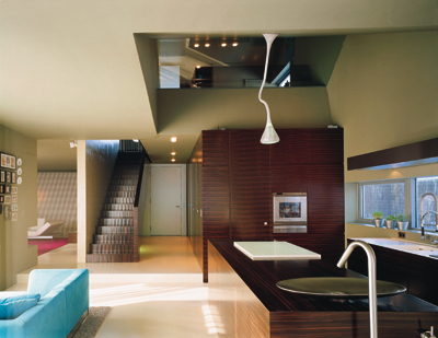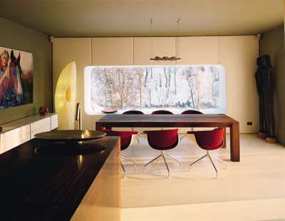 Dynamisch kippt einem am Eingang die Wand im vorspringenden, östlichen Hausteil entgegen, durchs Windfangglas sieht man die mit dem Hang hinabgleitende Dachfläche entlang durch den fließenden Wohnraum ins abschließende, schräge Südpanoramaglas. Wie im riesigen Fernsehbildschirm zeigt sie das Gebüsch, unter dem der Bach als lebendig-allgegenwärtige Geräuschkulisse vorbeirauscht. Ein horizontales Ostfensterband weitet die Perspektive beim Abwasch in der freistehenden Küche, gegenüber tritt man durch raumhohe Schiebetüren auf die Terrasse. Der ganze Wohnraum hat vierseitig Licht und Ausblick, fließend geht er im Westen mit Übereck-Glas zu Innenhof und schräger Nordwand in die Medien-Lounge über. Als zweite künstliche Screen sitzt der Design- Fernseher in der olivfarbenen Betonwand, an deren Rückseite die Stiege hinauf führt.